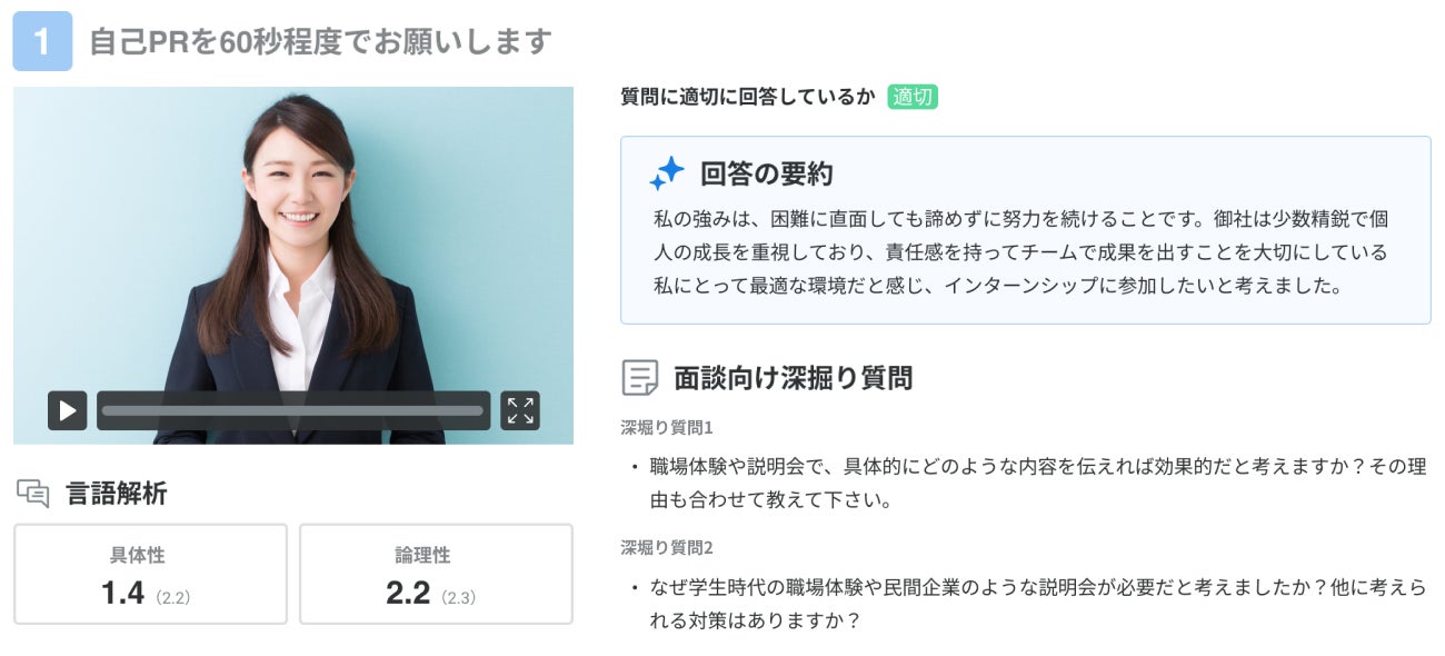 初期選考で提出された自己PR動画の内容をもとに、その後の面接で深掘りすべき質問をAIが自動生成します。本機能により、面接担当者の負担を軽減するとともに、応募者の潜在能力や適性を引き出す効果的な面接を実現します。
