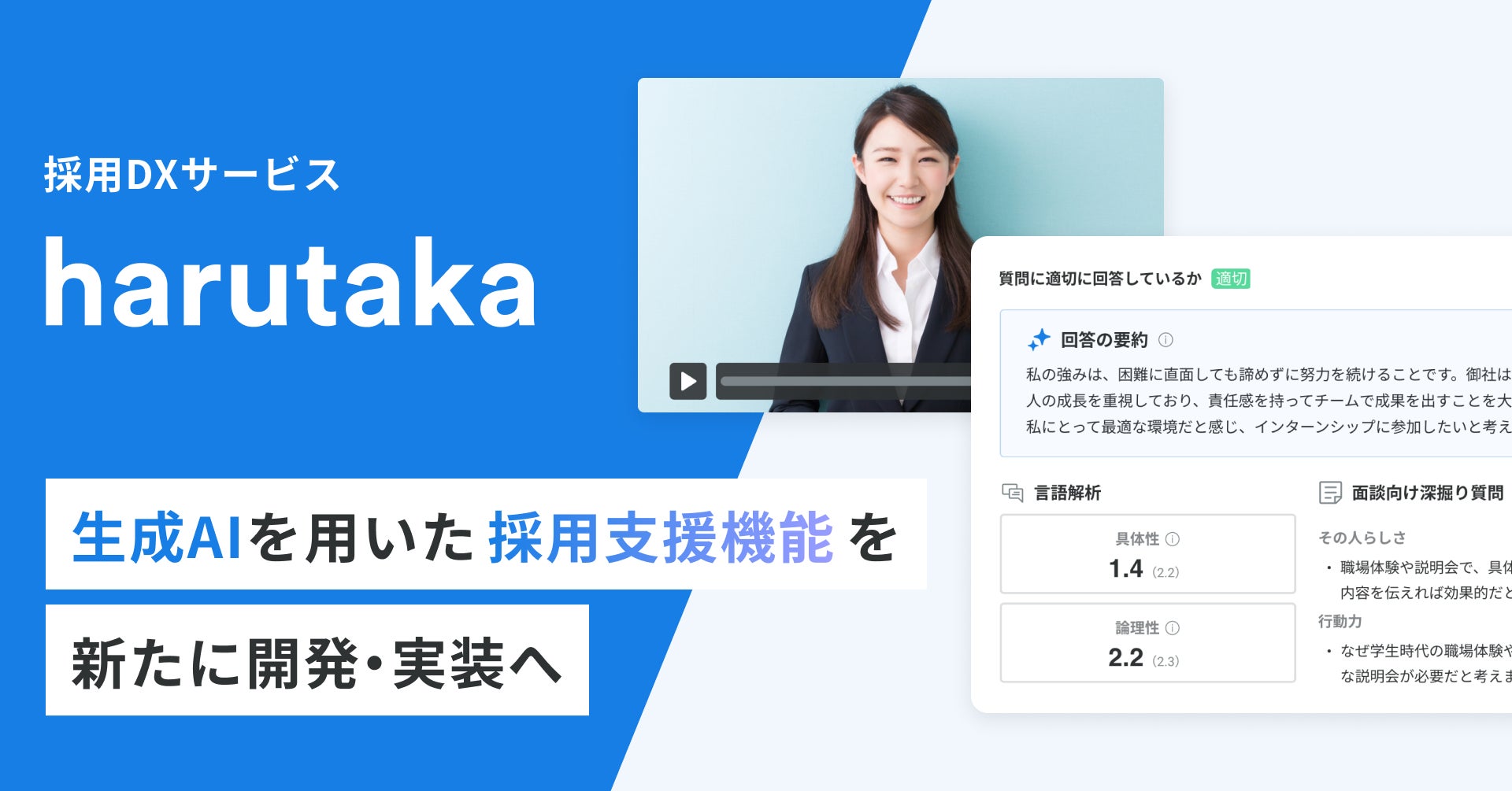 AIを活用し、初期選考では応募者の魅力を発掘するために、自己PR動画による録画選考機能を提供し、面接では業務効率と採用体験の向上をWeb面接機能で実現します。さらに「harutaka」に蓄積された面接データ、選考結果といった採用データを組み合わせることで、総合的な観点から採用活動全体の振り返りを可能にし、企業の採用力の向上や成長力の強化に貢献します。
