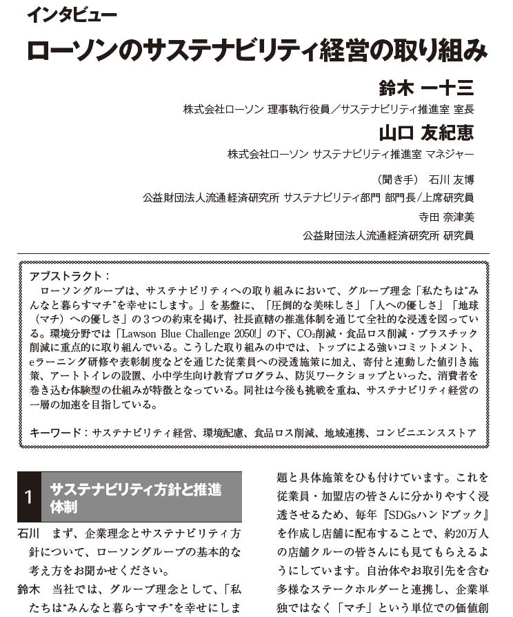 また、コンビニエンスストア大手・ローソンのサステナビリティ推進室へのインタビューを通じ、商品・店舗・地域の各領域における取り組みを紹介しています。