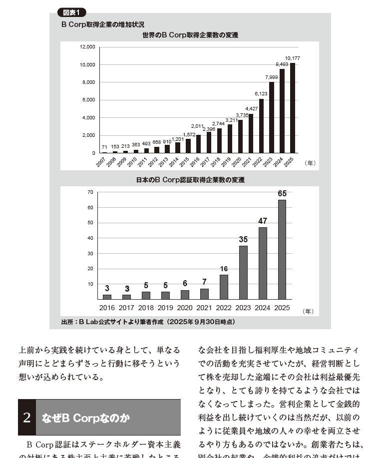 加えて、企業の社会的責任を高い基準で評価する国際的認証制度「B Corporation(B Corp)」の最新動向を解説。より良い社会を実現するための新たな指標としての可能性を探っています。