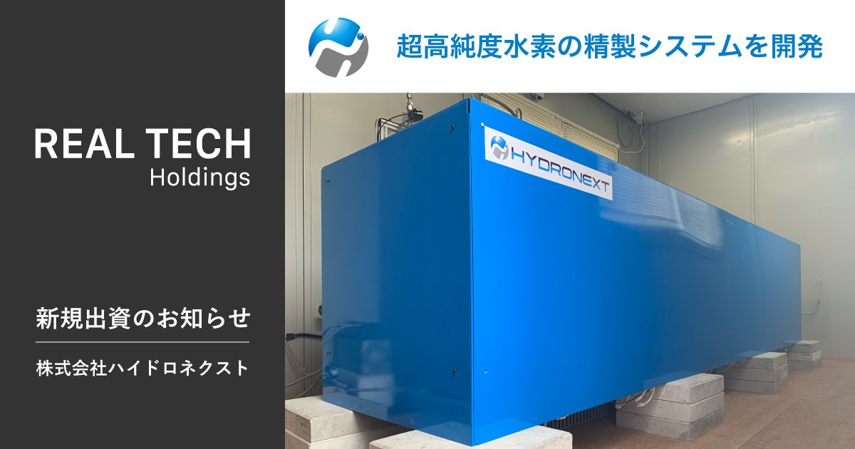 リアルテックホールディングス、超高純度水素の精製システムを開発するディープテックスタートアップ「ハイドロネクスト」への出資を実施