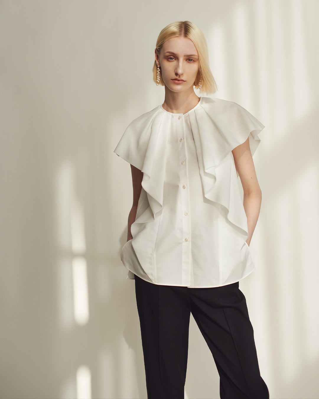 意識的なドレープ、フリル、ボリューム感、構築的なシルエット。