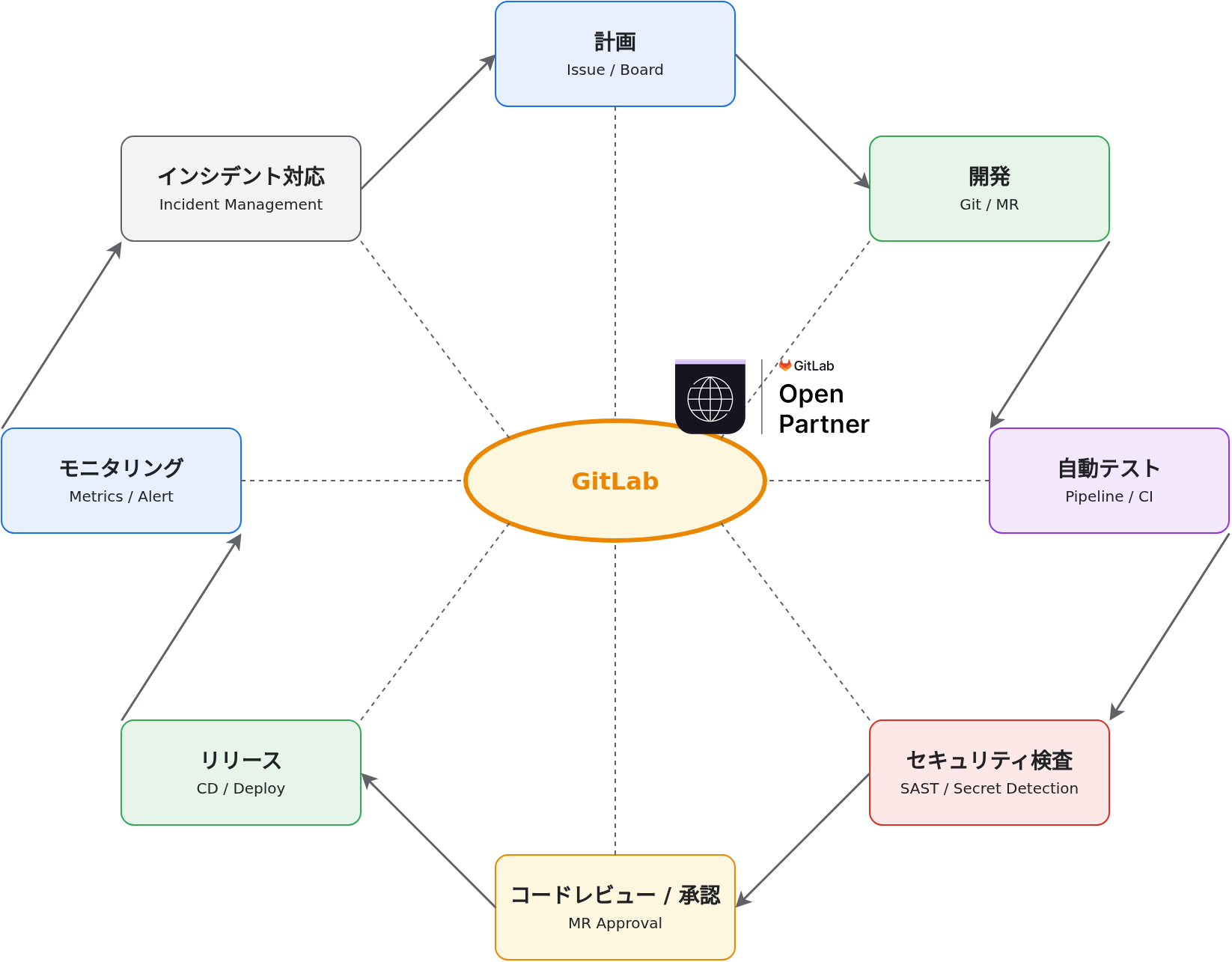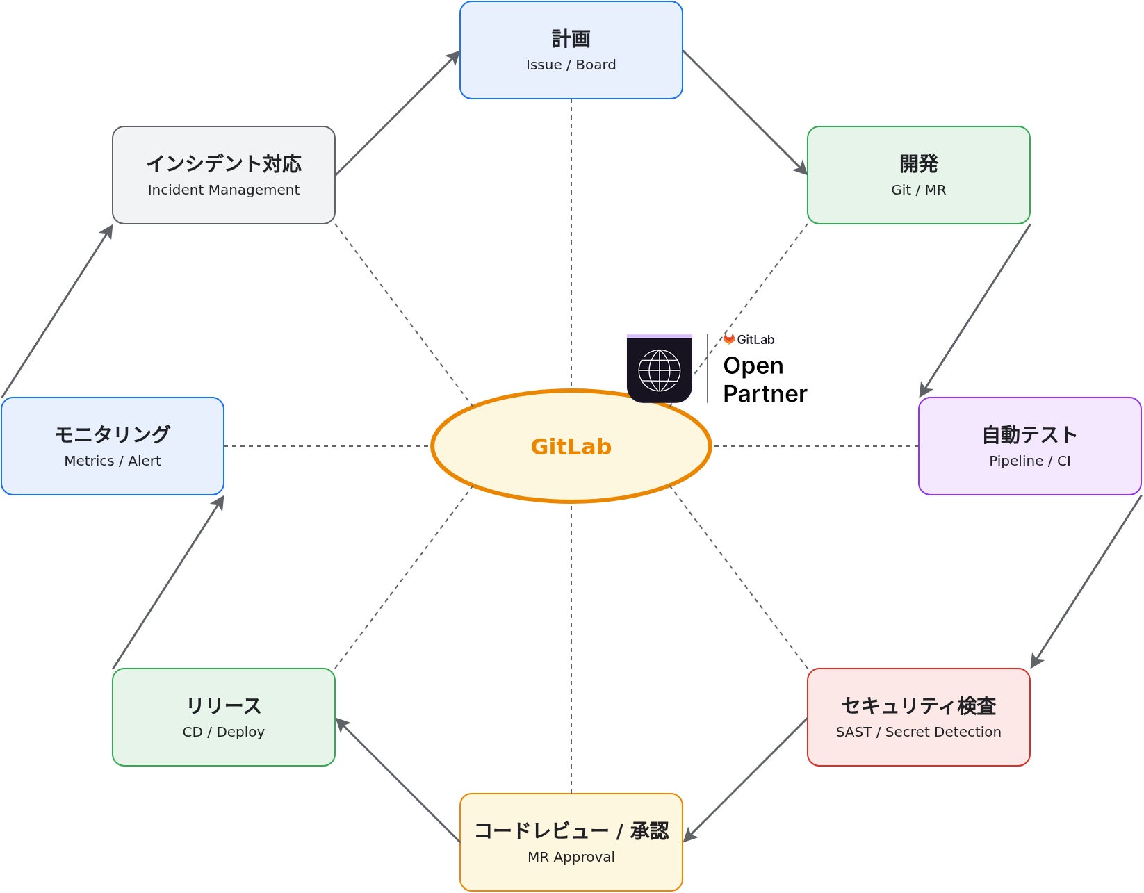 当社はGitLab Open Partnerの認定を受けており、本サービスではGitLabを開発・運用の中核プラットフォームとして採用しています。GitLabはソフトウェア開発ライフサイクル全体をカバーする統合プラットフォームであり、ツールの乱立を防ぎ、1つのプラットフォームで開発から運用までを管理することが可能です。これにより、開発プロセスの標準化を推進し、開発スピードと品質の向上を実現します。
