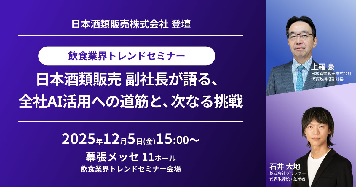 生成AI活用による企業変革を実現する株式会社グラファー(本社:東京都渋谷区、代表取締役:石井大地、以下「当社」)は、2025年12月3日(水)~5日(金)に幕張メッセで開催される「飲食業界イノベーションWeek 東京」に出展します。会期中には、展示会場内セミナー「飲食業界トレンドセミナー」において、4日(木)に国分グループ本社株式会社、5日(金)に日本酒類販売株式会社を迎えた対談セッションを開催します。