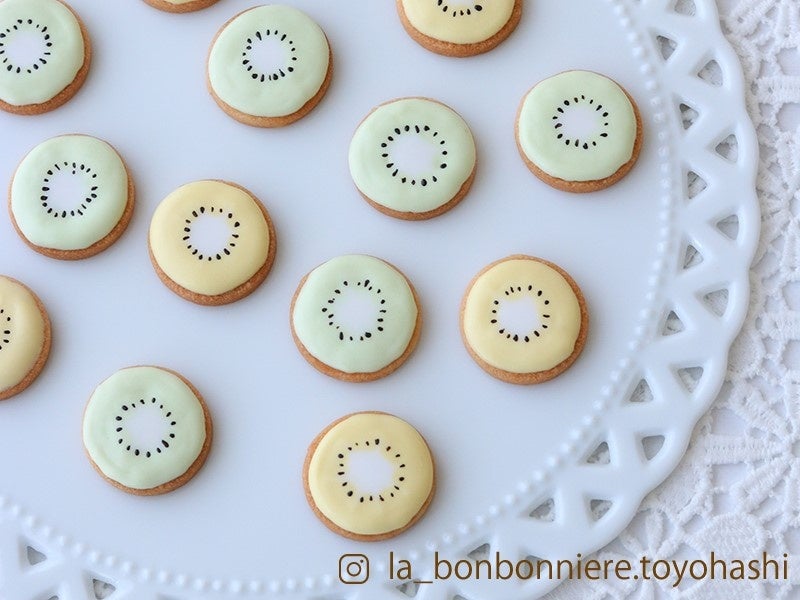 キウイアイシングクッキー(左)とキウイパウダーをまぶしたブールドネージュ(右)