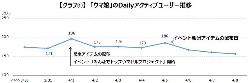 iGageでこの期間のDAU(デイリーアクティブユーザー)の推移をみると、イベントが開始された4月1日に196万人と、ユーザー数が最も多くなっています。2日~4日のイベント期間も、170万人以上と、比較的高い水準でアクティブユーザー数をキープしています。そして配布ミスがあった4月5日は、186万人と、イベント期間中の2日~4日より10万人以上のユーザー数となっていることがわかります。【グラフ①】
