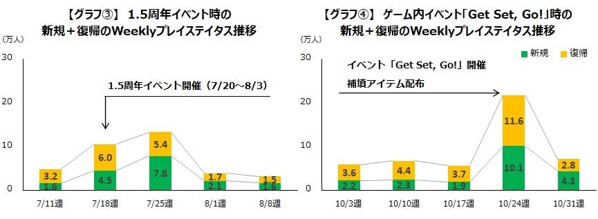 また、その週に獲得した新規・復帰ユーザー数を見るとトラブルがあった10月24日週には新規・復帰ともに10万人以上のユーザーを獲得しています。【グラフ④】