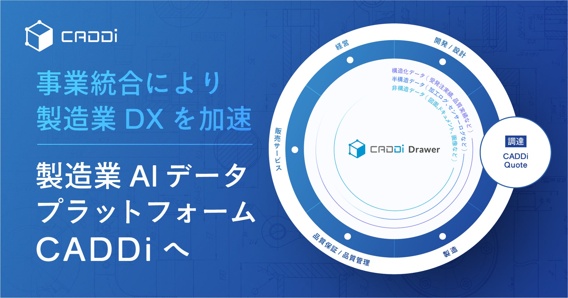 製造業のデジタル変革に挑むキャディ株式会社(本社:東京都台東区、代表取締役:加藤 勇志郎、以下キャディ)は、部品調達プラットフォームCADDi Manufacturing と 図面データ活用クラウドCADDi Drawer の2つのサービスの事業を統合し、「製造業AIデータプラットフォームCADDi 」へと転進することをお知らせいたします。