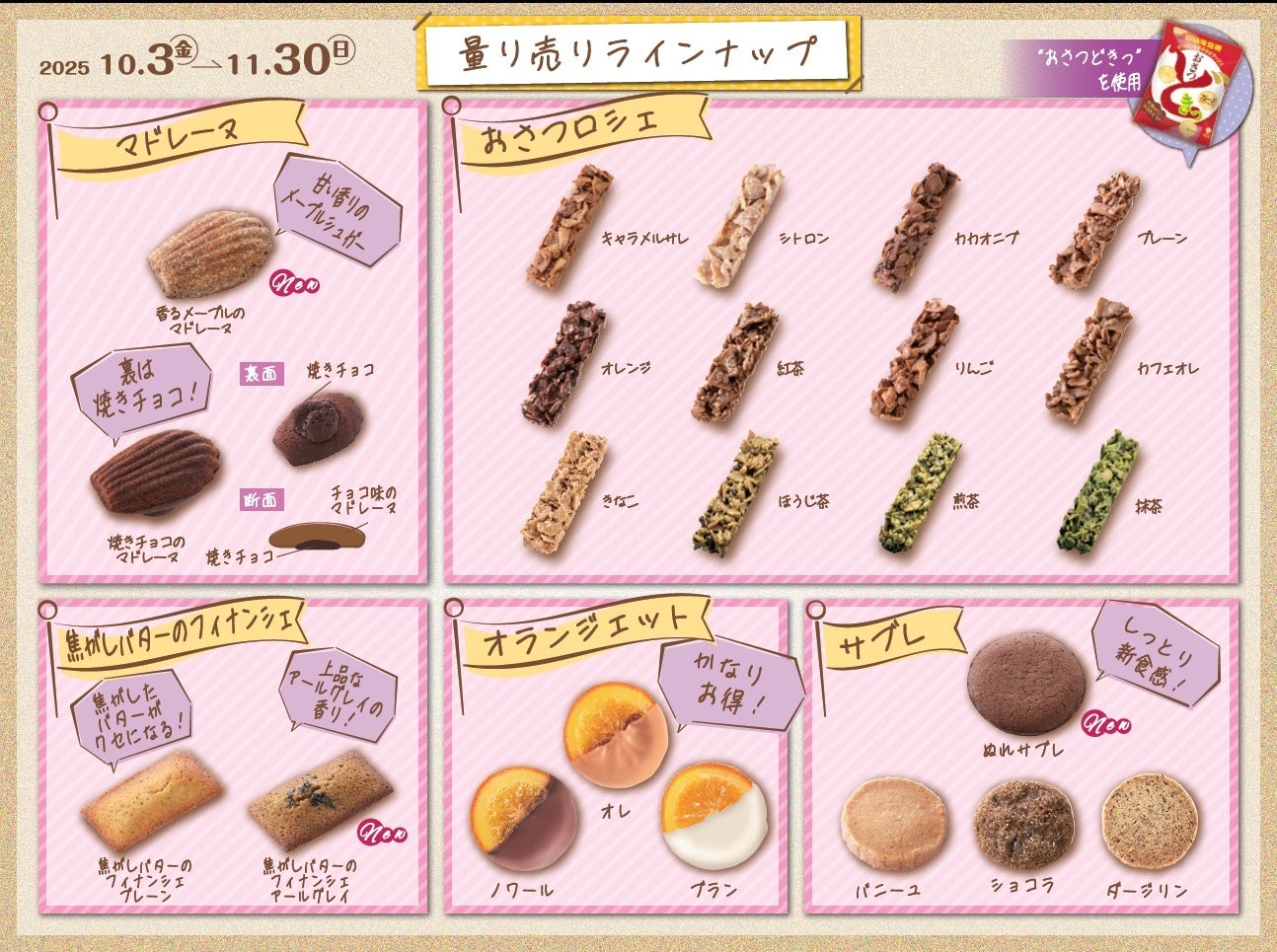 大阪(松屋町)にあるチョコレート専門店「Cagi de rêves(キャギ ド レーブ)」は、2025年10月3日(金)から11月30日(日)までショップのあるUHA味覚糖大阪本社1階で毎年恒例の人気企画「量り売りマルシェ」を開催します。今年は新作のマドレーヌ、フィナンシェに新食感サブレを加えて、昨年よりさらにバージョンアップした全23種を自由に選べるように量り売りで販売します。さらに、昨年好評だったマイバック持参でお得なサービスやサスティナブルショコラの販売も期間限定で実施します。