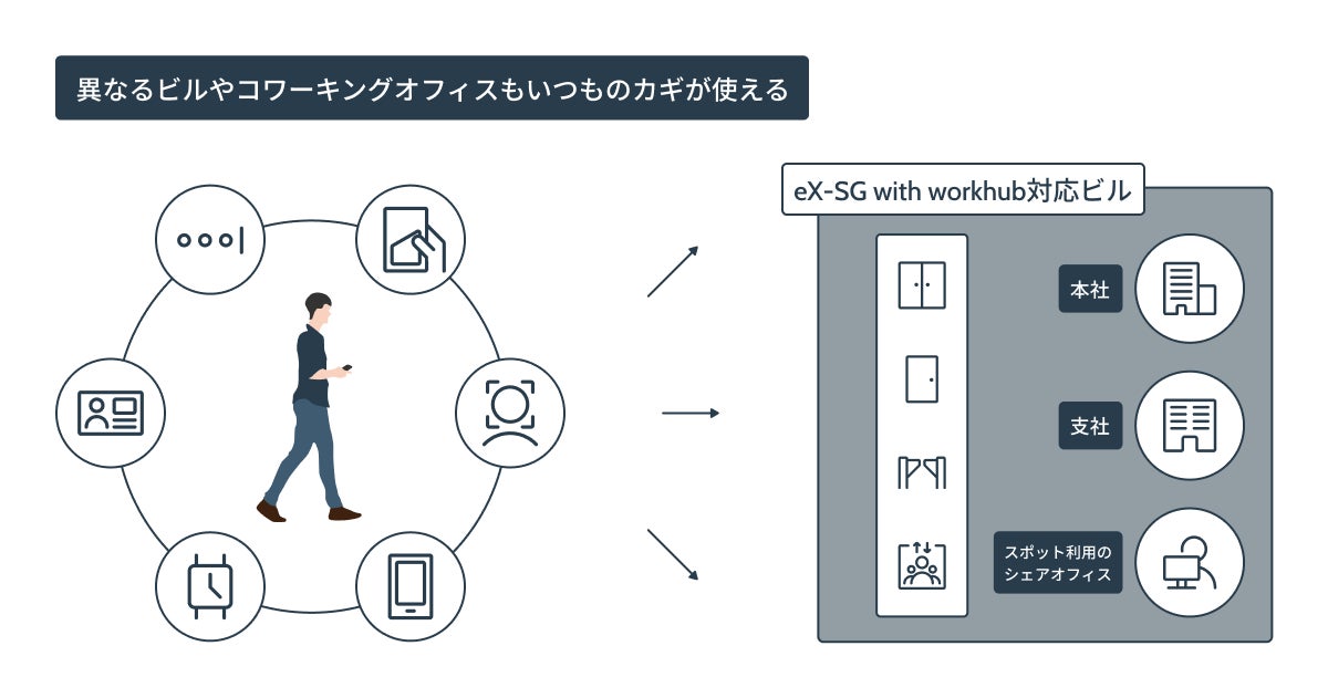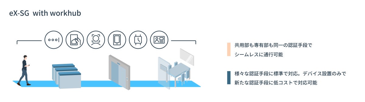 ビルオーナーや管理者は、竣工時・竣工後問わず認証手段を自由に選択し、大規模な工事無しで追加できます。eX-SG同様ICカードのみの運用も可能です。2022年秋時点で、顔認証、スマートフォンアプリ、QRコード、スマートウォッチ、モバイルFeliCa(※5)、ICカードなどに対応予定です。