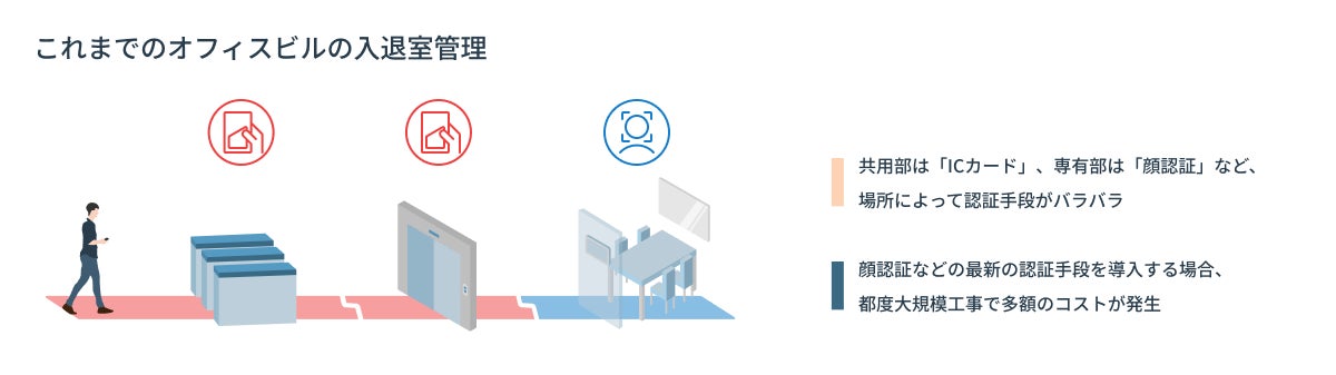昨今、出社とテレワークを組み合わせたハイブリットワークやABW(※1)の導入が増加しています。そのため、企業(以下、テナント)は複数拠点を利用する社員への入館証の発行や管理が煩雑になっており、ワーカーも、拠点毎に複数のICカードを持ち歩いたり、入館手続きが必要になったりと、ビル内の共用部と専有部や、ビル間での「認証」が連携されていない課題が浮き彫りになってきました。