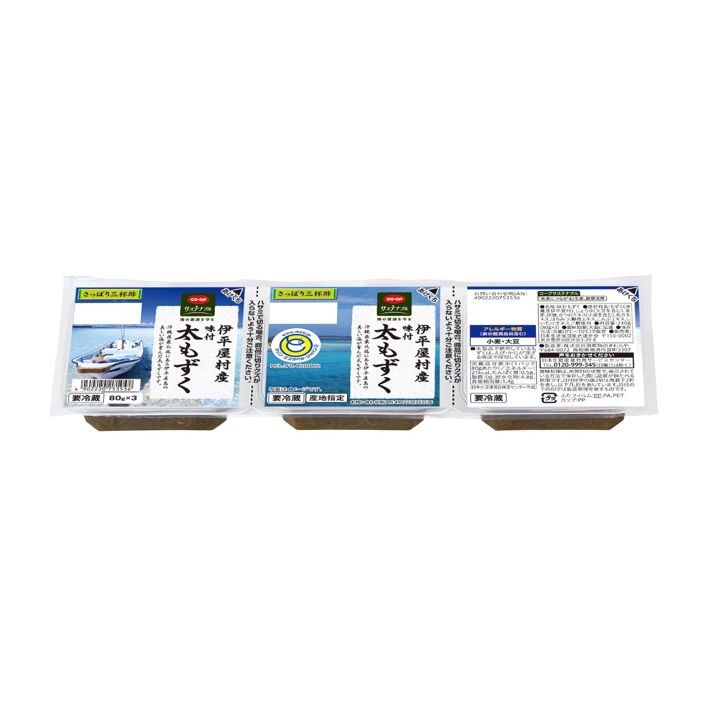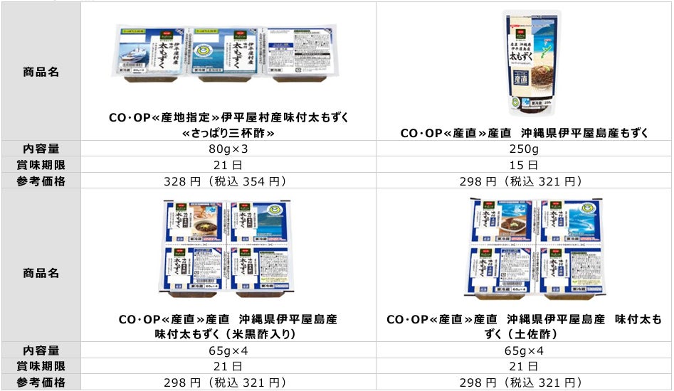 ※コープデリ連合会では「CO・OP≪産地指定≫伊平屋村産味付太もずく≪さっぱり三杯酢≫」、「CO・OP≪産地指定≫沖縄県伊平屋島産味付もずく(三杯酢)」の取り扱いはありません。