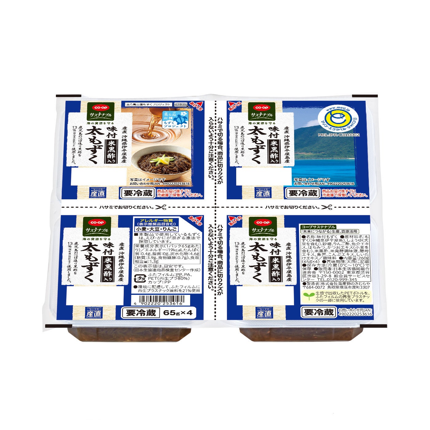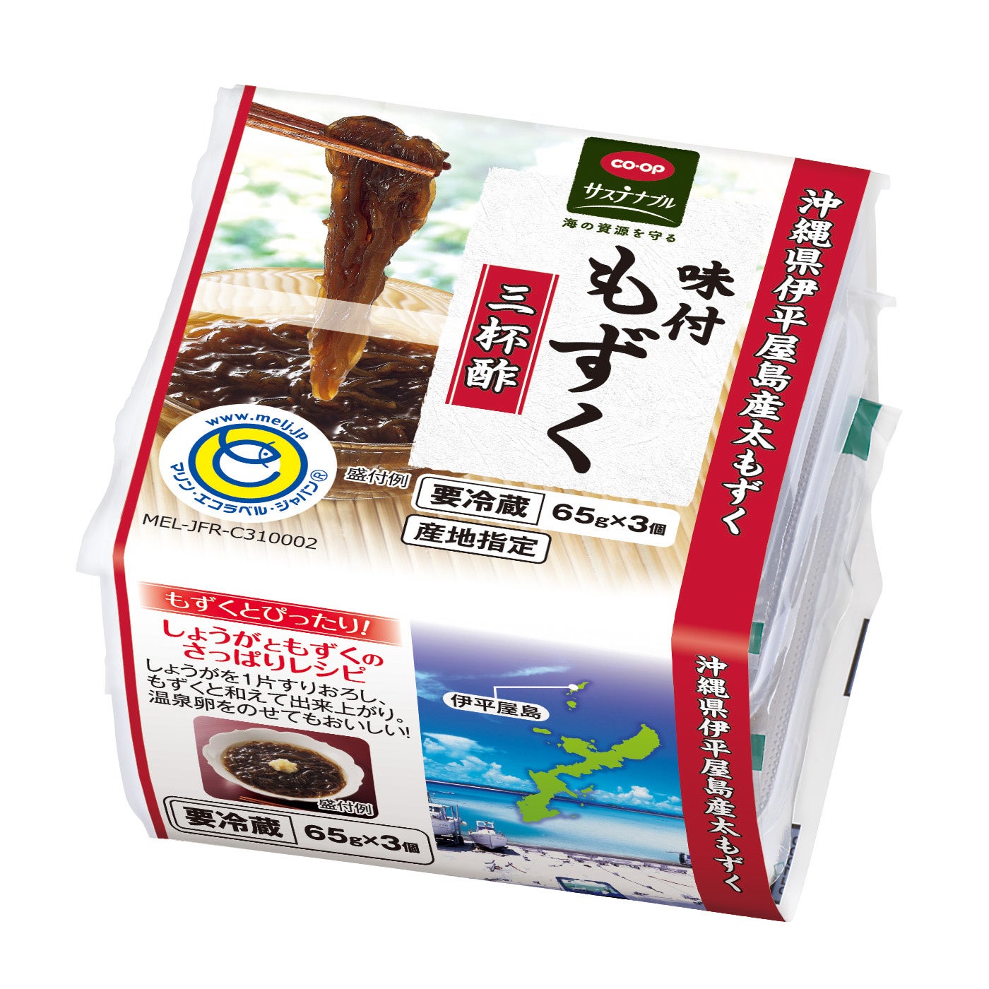 日本生活協同組合連合会(略称:日本生協連、代表理事会長:新井ちとせ)、コープデリ生活協同組合連合会(本部:埼玉県さいたま市、代表理事理事長:熊﨑伸、関東信越の6生協、以下コープデリ連合会)は、伊平屋村漁業協同組合の「オキナワモズク海面養殖」がMEL養殖認証*1を取得したことを受けて、発売中の「CO・OP 沖縄県伊平屋島産味付もずく米黒酢入り」をはじめとするもずく商品を、順次MELロゴマーク付きパッケージに切り替え、コープサステナブル*2“海の資源を守る”の商品として販売します。