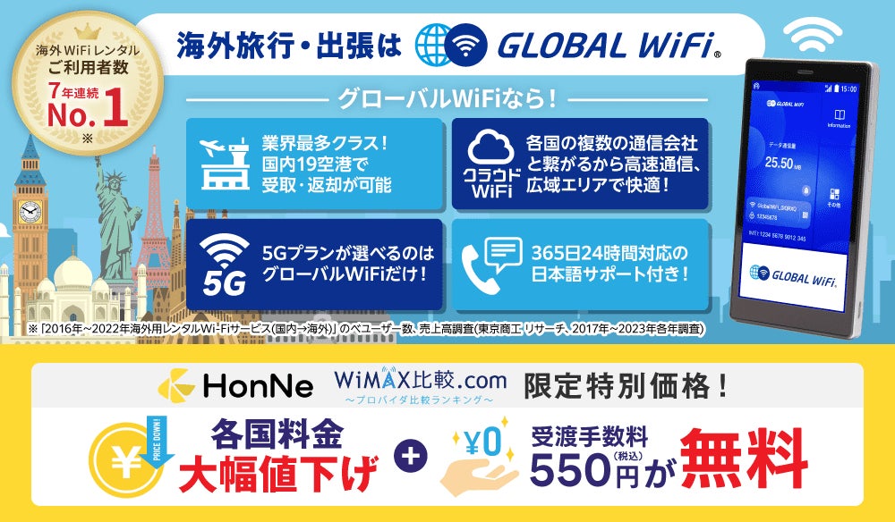 グローバルWiFiはHonNe、もしくはWiMAX比較.comから申し込むことで、公式サイトよりも安くレンタルできます。