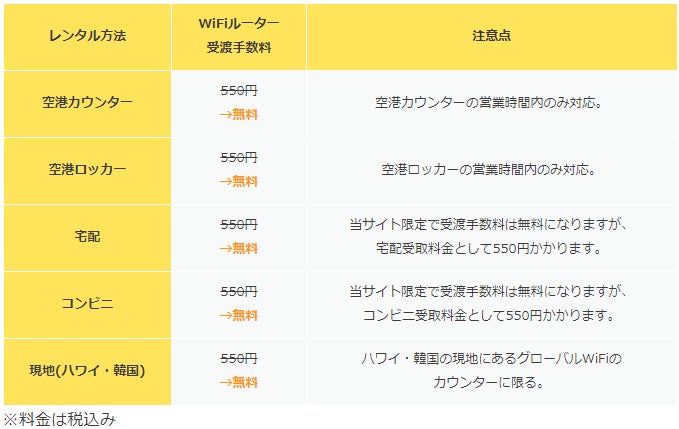 さらに、グローバルWiFi公式サイトで申し込んだ場合、WiFiルーター受渡手数料に通常550円かかりますが、HonNe・WiMAX比較.com経由で申し込むと、受渡手数料が無料になります。詳細は以下をご確認ください。