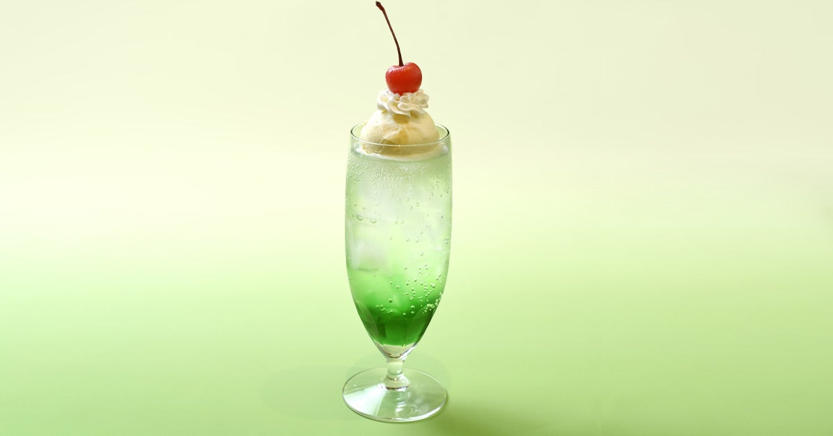 メロンソーダにバニラアイス・ホイップ・チェリーをトッピングした、昔懐かしいレトロなテイストのクリームソーダです。ノスタルジックな雰囲気をお楽しみください。 |