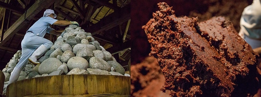 大豆と塩を木桶に仕込み、円錐状に積み上げられた約3トンもの重石をのせて2年以上熟成。天然醸造ならではの濃厚なコクと、ほのかな酸味・渋み・苦みが重なり合う、唯一無二の味わいが特徴です。