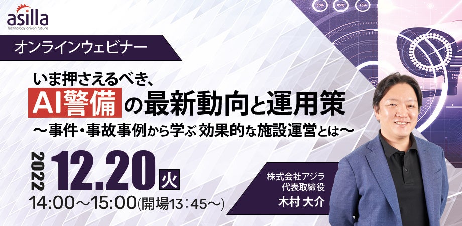 施設向けAI警備システムを提供する株式会社アジラ(本社:東京都町田市、代表取締役:木村 大介、以下「アジラ」)は、オンラインウェビナー「~事件・事故事例から学ぶ~いま押さえるべき、AI警備の最新動向と運用策」を2022年12月20日火曜日に開催いたします。