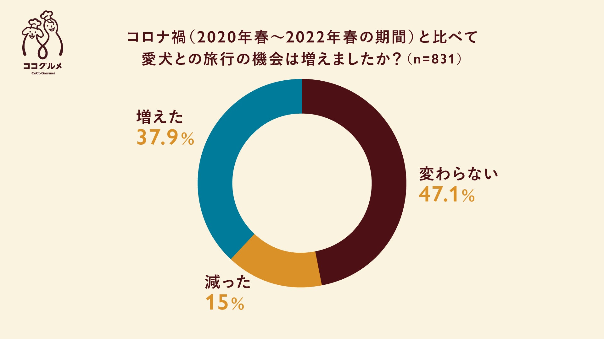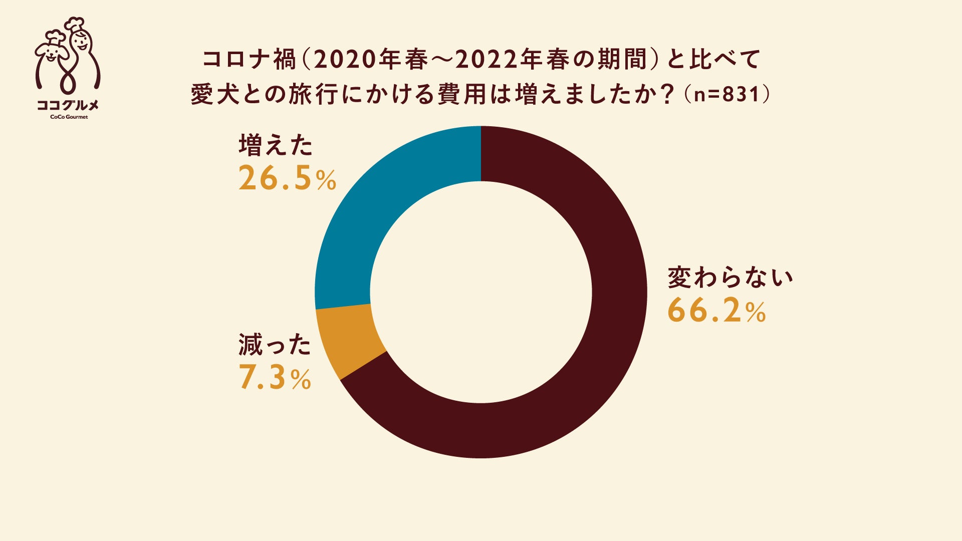 愛犬との旅行回数は1回の割合が最も少なく、2〜5回が38%、10回以上が35%。26.6%がコロナ禍より旅費が増えたと回答。