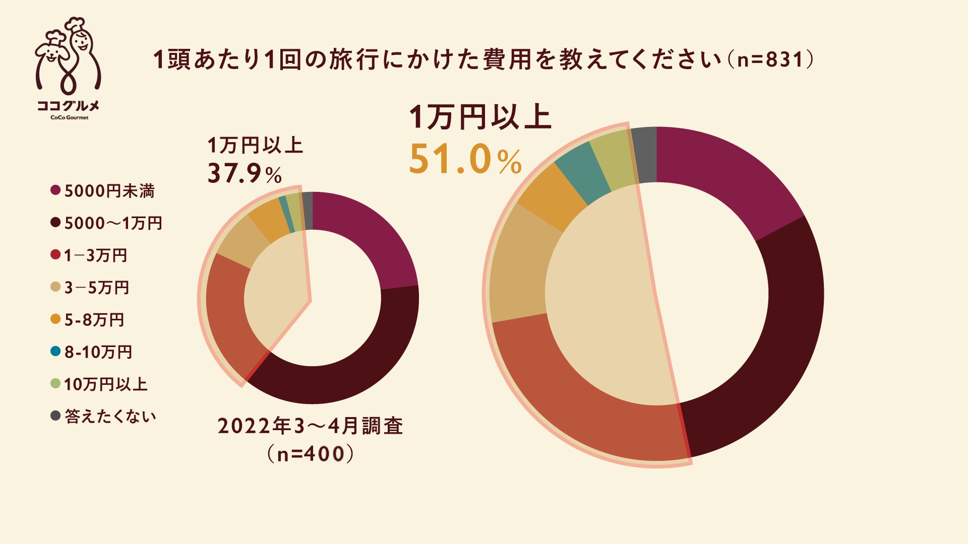 旅行1回につき1頭あたり1万円以上をかける飼い主は、前回調査時の37.9%に対し51.0%と半数を超えた