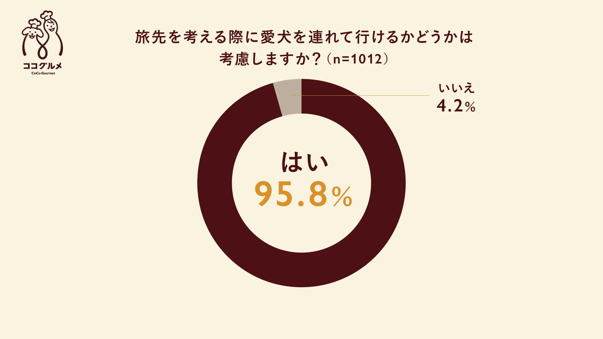 ペットツーリズム需要はここ数年高い状態が続いており、旅先選びに愛犬を連れて行けるかどうかを考慮する人は95.8%と高い。