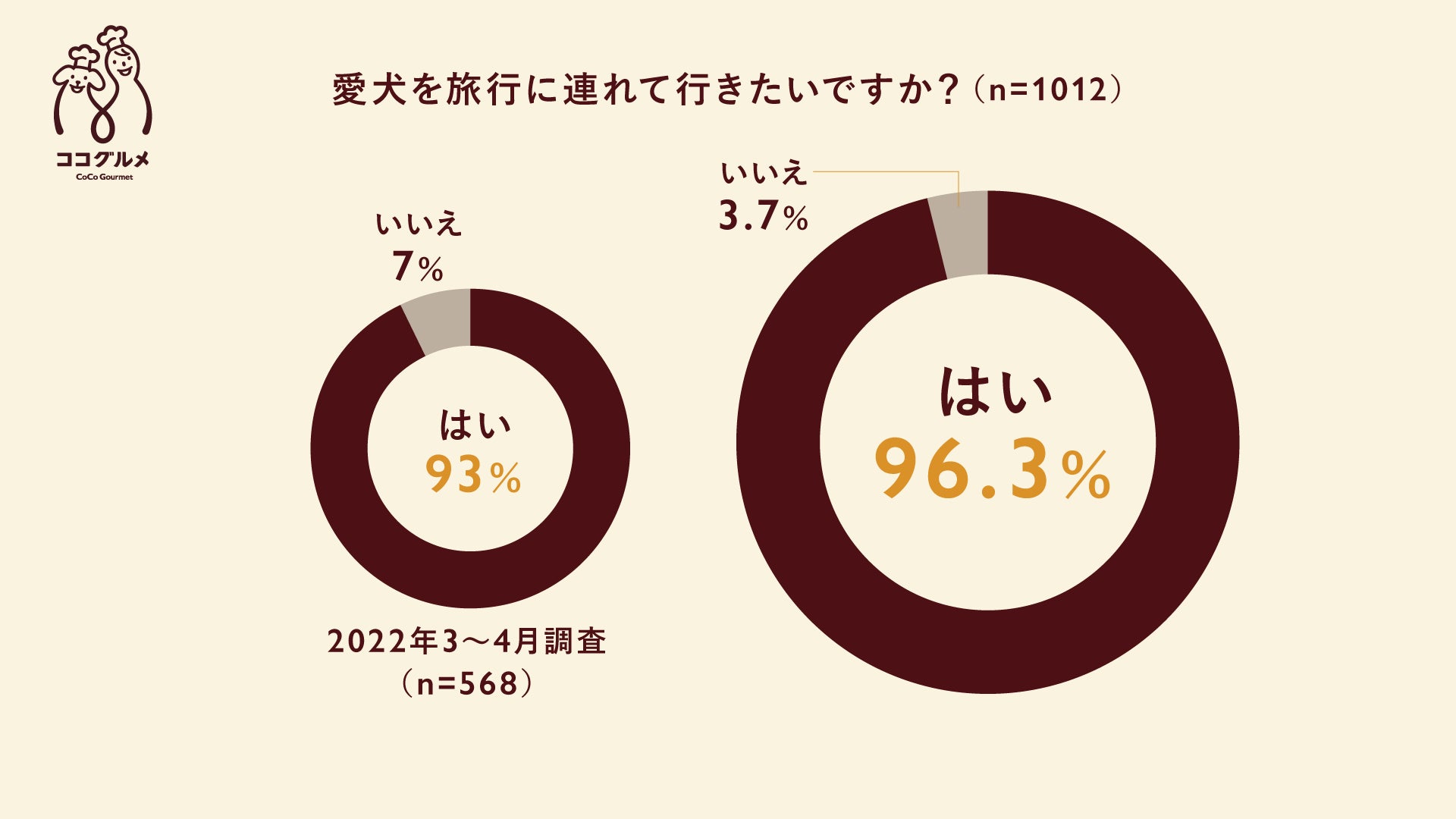 愛犬を旅行に連れて行きたい飼い主は3.3%増加し96.3%になり、愛犬と旅行にいったことがある飼い主は、前回調査の70%から82%に増えた。