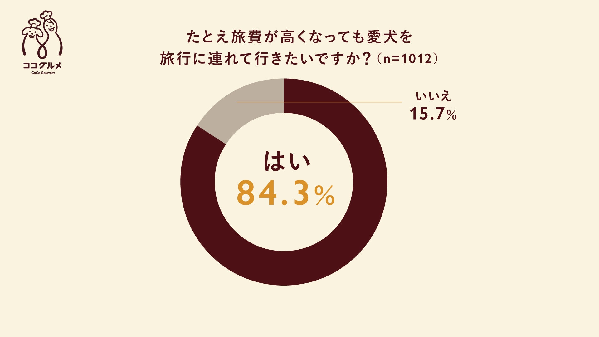 旅費が高くなったとしても愛犬を連れて行きたい飼い主は84.5%を超え、一頭あたり1回の旅費に1万円以上をかける飼い主は、37.9%から50.6%に増加。