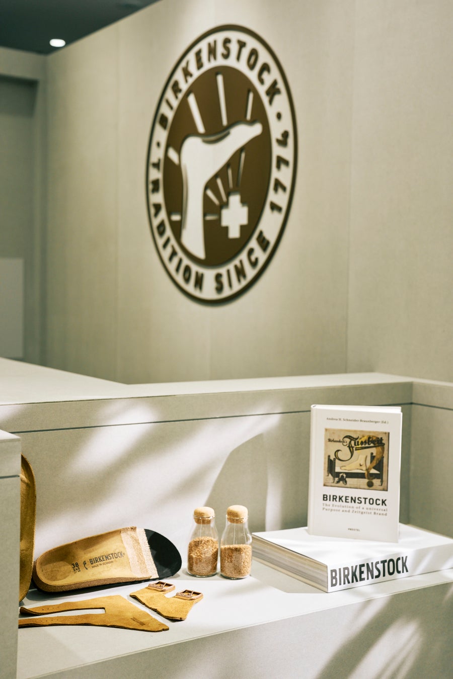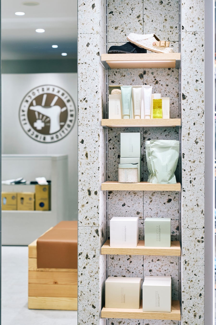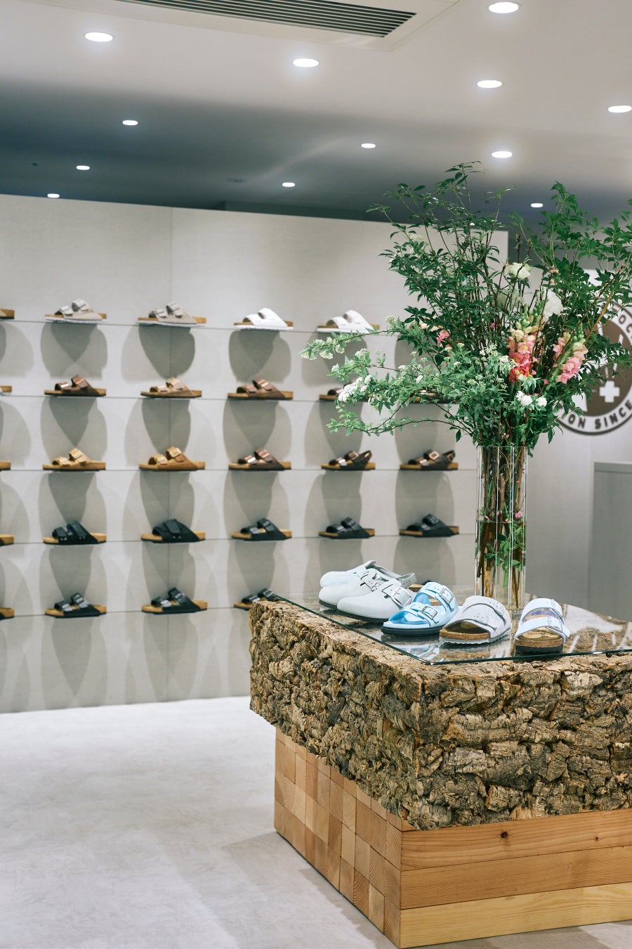 日本のマーケットへ向けた新しいストアコンセプトが取り入れられたインテリアは、BIRKENSTOCKを代表する素材であるコルク、ユニークな風合いがブランドらしい大谷石、ナチュラルな木材やフェルトなど、天然由来の素材を多く用いて、BIRKENSTOCKの伝統や品質を照らし出しています。
