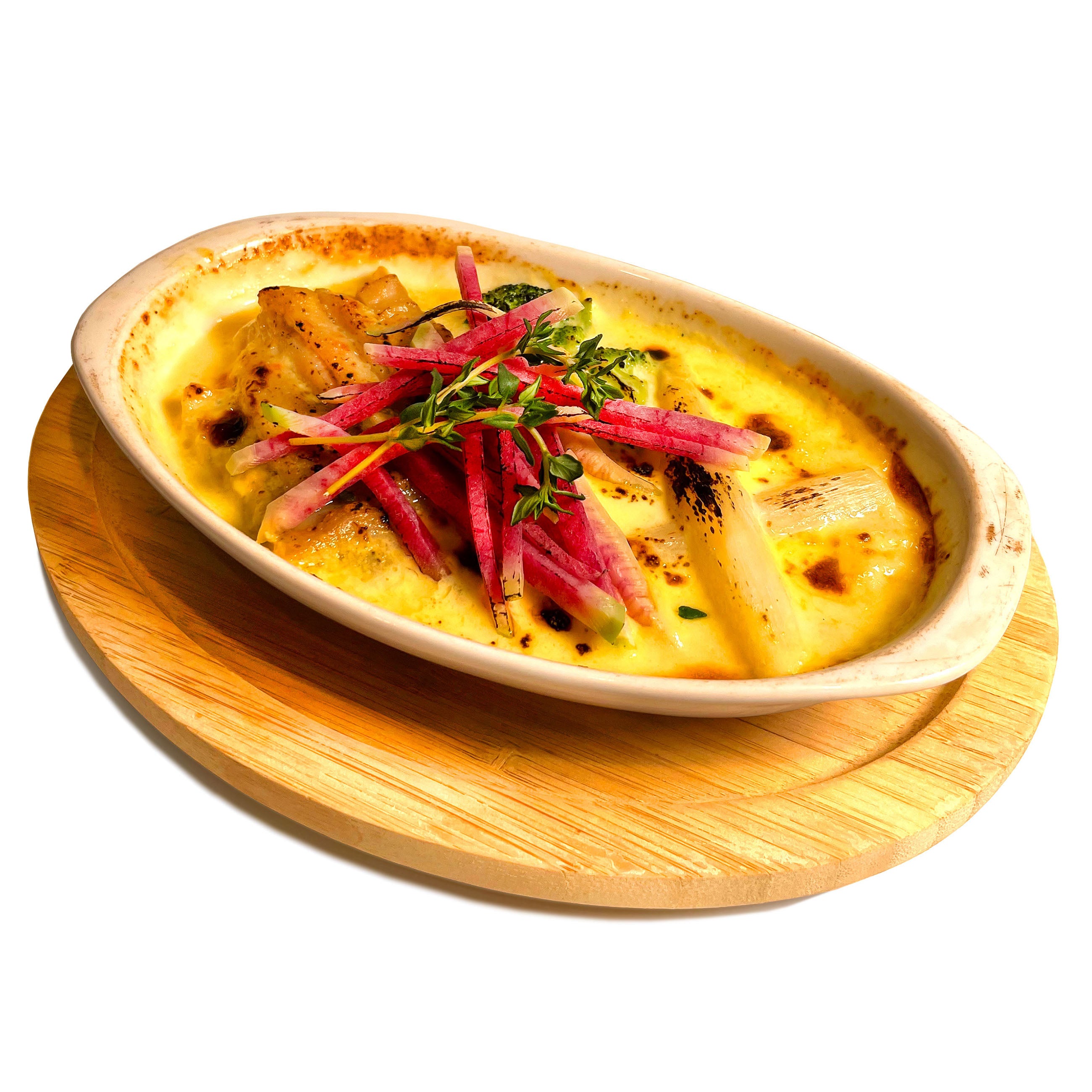 ・梅香る鶏モモ肉とホワイトアスパラのハーブ香るチーズソース焼き