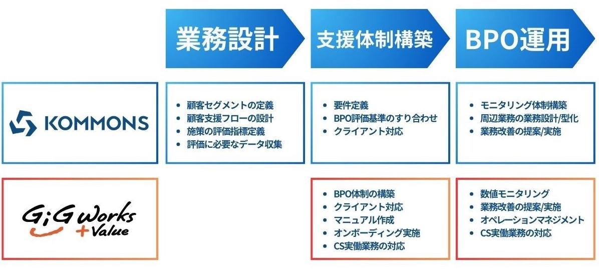 KOMMONSカンパニーがCS部門立ち上げに必要な業務設計・KPI設計・モニタリング体制構築などの要件整理を担当し、その設計に基づいてギグワークスアドバリューがBPO(※)体制の構築および運用を実施します。両社の強みを活かすことで、迅速かつ柔軟なCS体制の構築・拡張を実現します。
