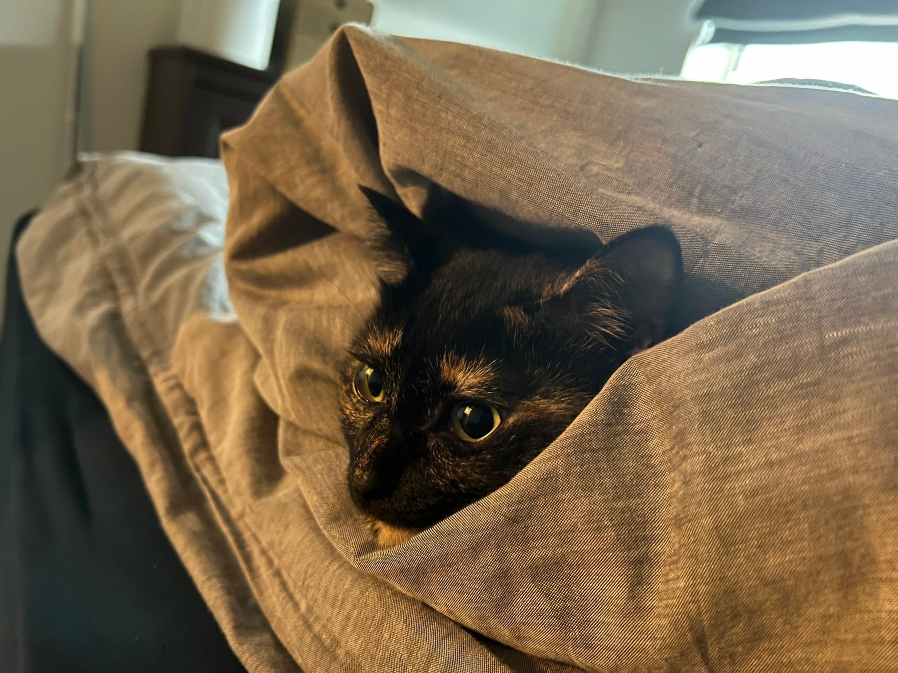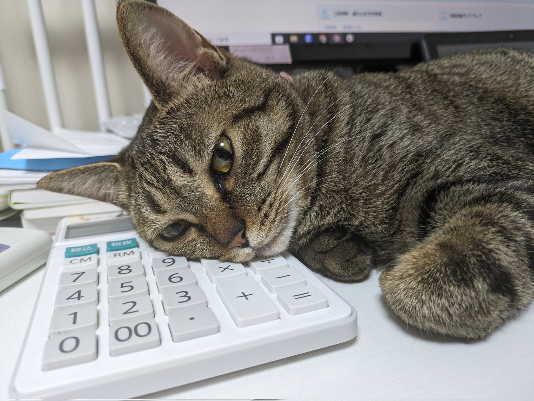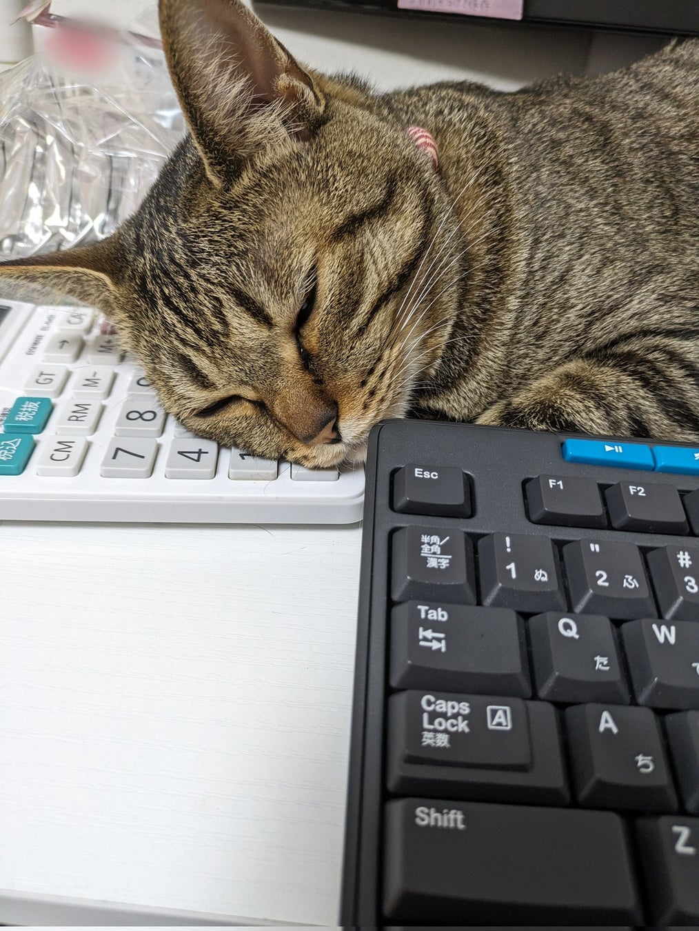電卓の上で邪魔することを理解しながらも、その後寝るという高度な癒しテクニックと猫らしさが決めてになりました。