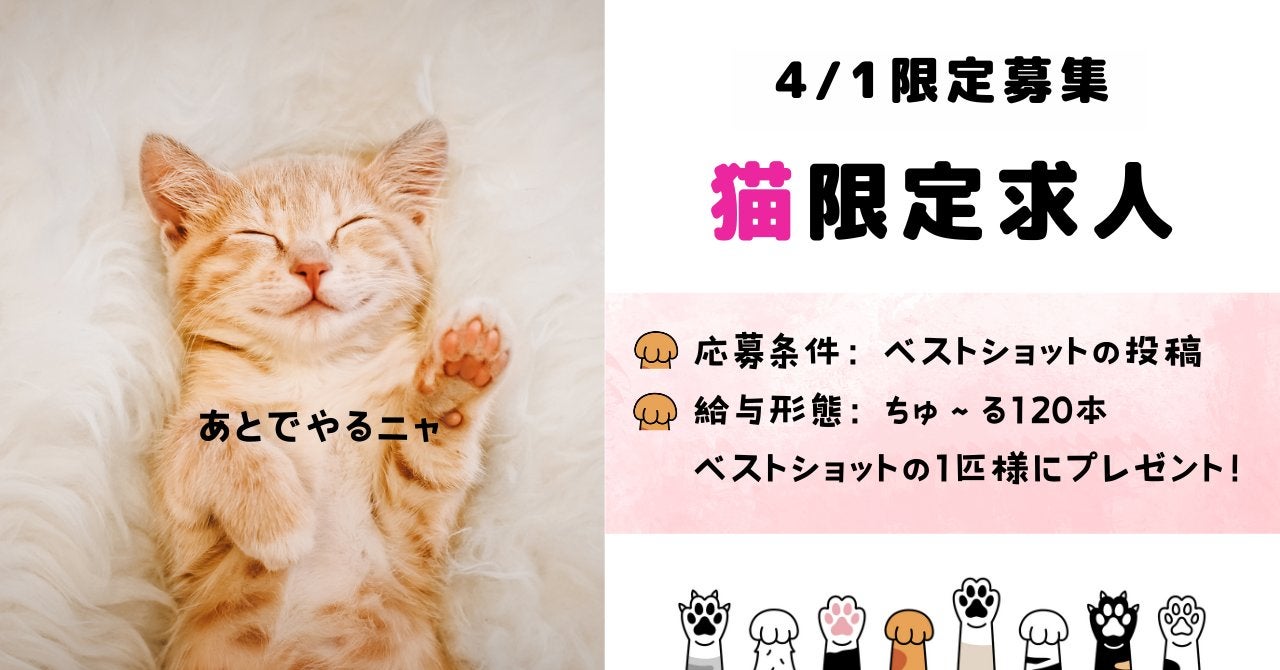 報酬「ちゅ〜る120本」猫限定求人!在宅にゃんこを4/1だけ募集