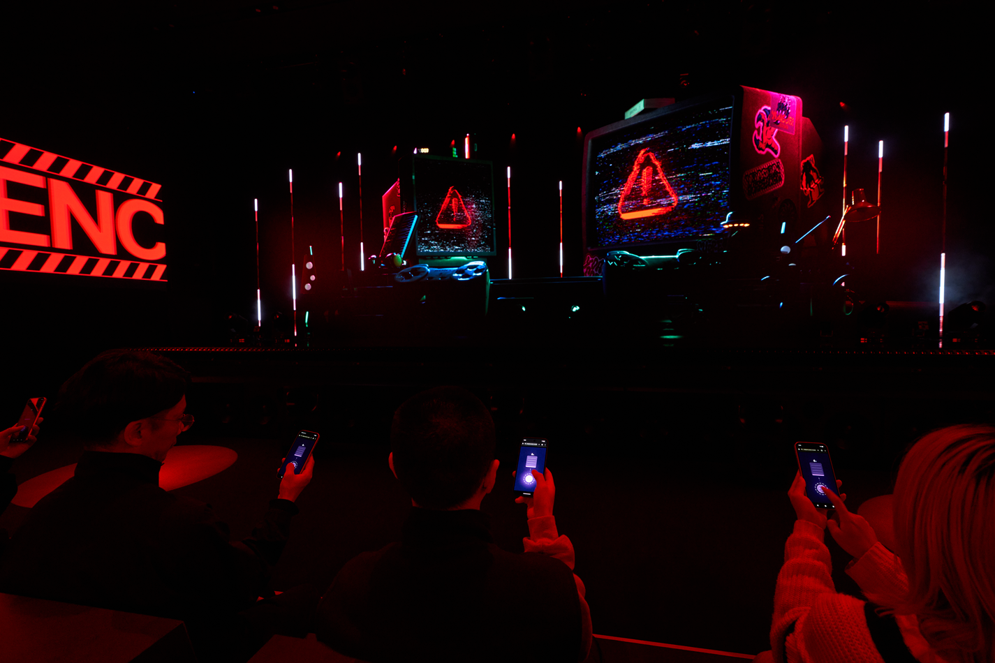 スマートフォンの音声や映像が、会場内の音響・映像設備と連動し、高精度に同期再生されることで、個人デバイスと空間演出が融合した没入感の高い体験