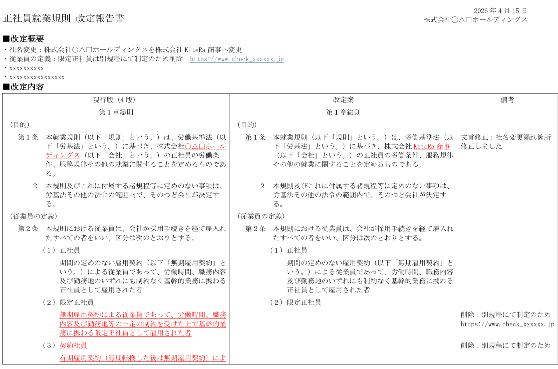 特に、グループ会社を有する企業では、組織再編や制度変更に伴い、複数の規程を同時に見直す場面も少なくありません。その際に求められるのは、条文単位の差分を確認することだけではなく、どの規程が、なぜ、どのように変わるのかを整理し、会議体や報告先ごとに必要な説明を行える状態をつくることです。