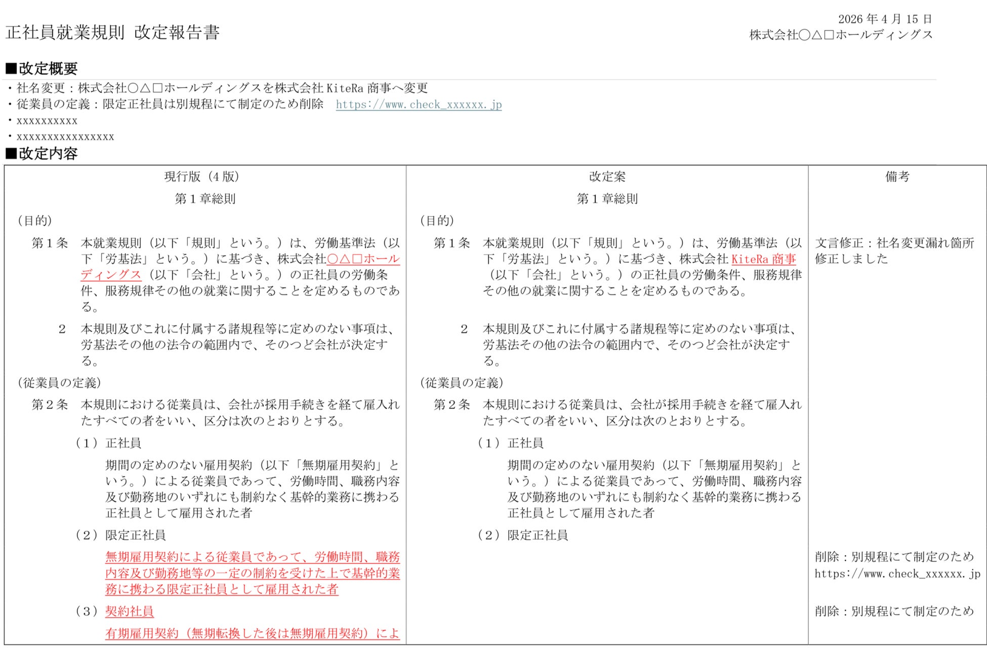 「安心して働ける世界をつくる」をミッションに掲げ、社内規程DXサービス「KiteRa Biz(キテラビズ)」と社労士向けサービス「KiteRa Pro(キテラプロ)」を提供する株式会社KiteRa(代表取締役 執行役員 CEO:植松隆史、本社:東京都港区、読み:キテラ、以下「当社」)は、規程改定時の説明・報告に必要な情報を整理する「改定報告書」および「制定・改定規程一覧」機能の提供を開始しました。
