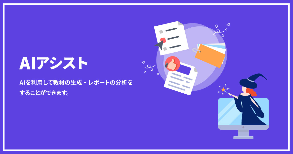 AIを活用して、クイズ・テストや暗記カードの作成、レポートの分析を自動で行うことができます。機能ごとに、それぞれご説明します。