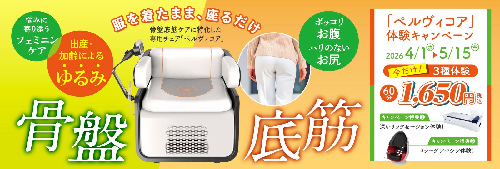 2026年4月1日(水)~5月15日(金)の期間、IPサロン東銀座店でもペルヴィコア体験キャンペーンを開催します。初めての方限定で、骨盤底筋ケアチェア「ペルヴィコア」、全身マッサージ機器「ウォーターウェーブベッド」、コラーゲンマシン「美YOU人egg(ビュートエッグ)」のお得な3種の機材体験が1,650円にてお試しいただけます。是非この機会にお越しください︕
