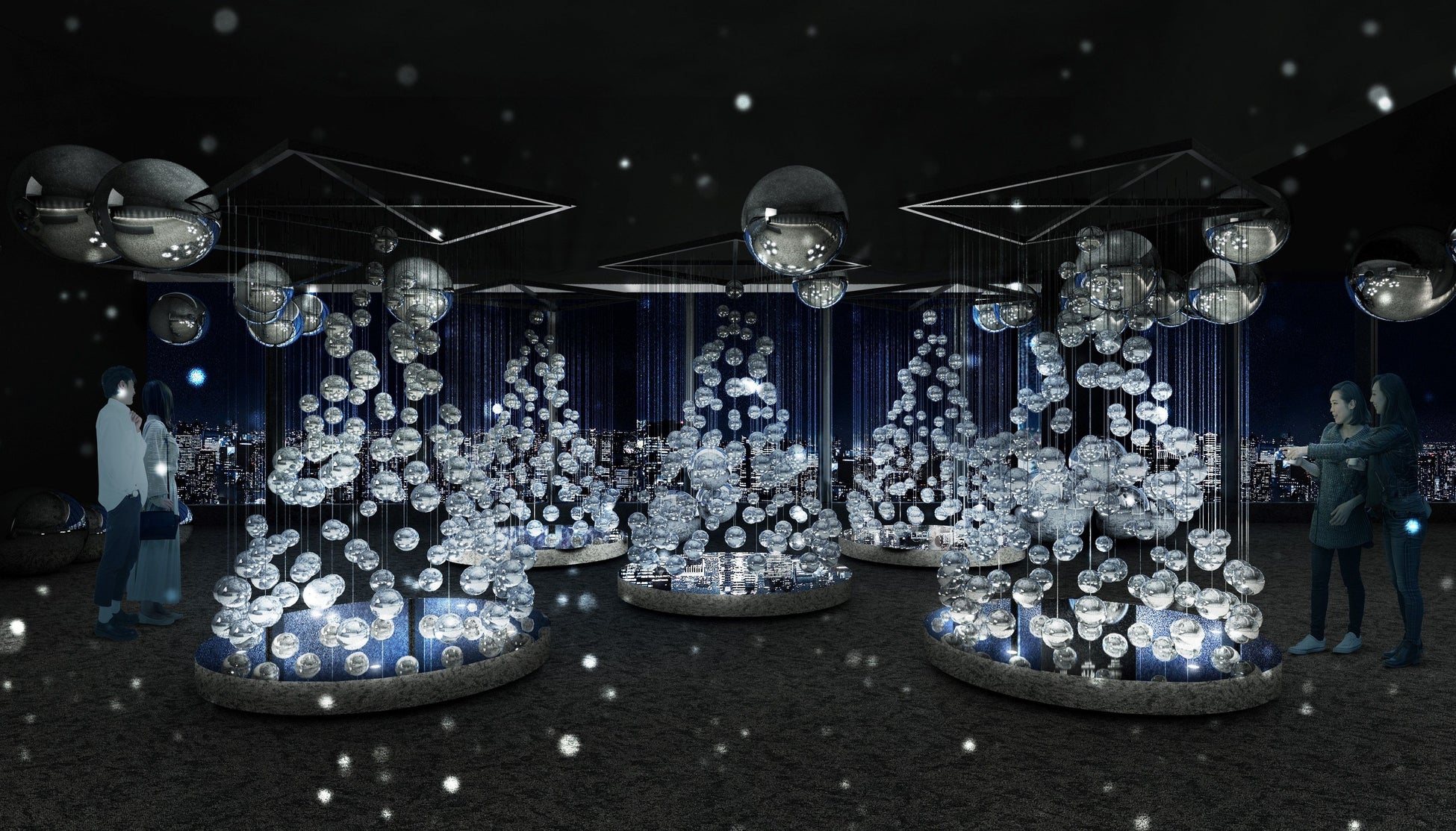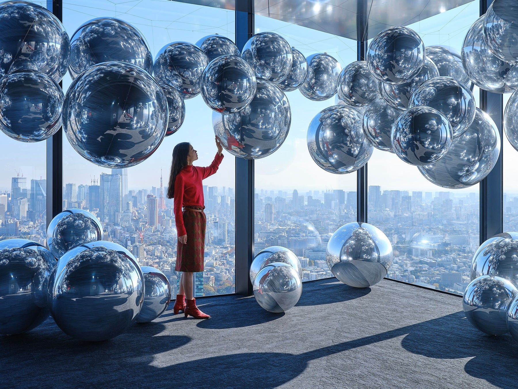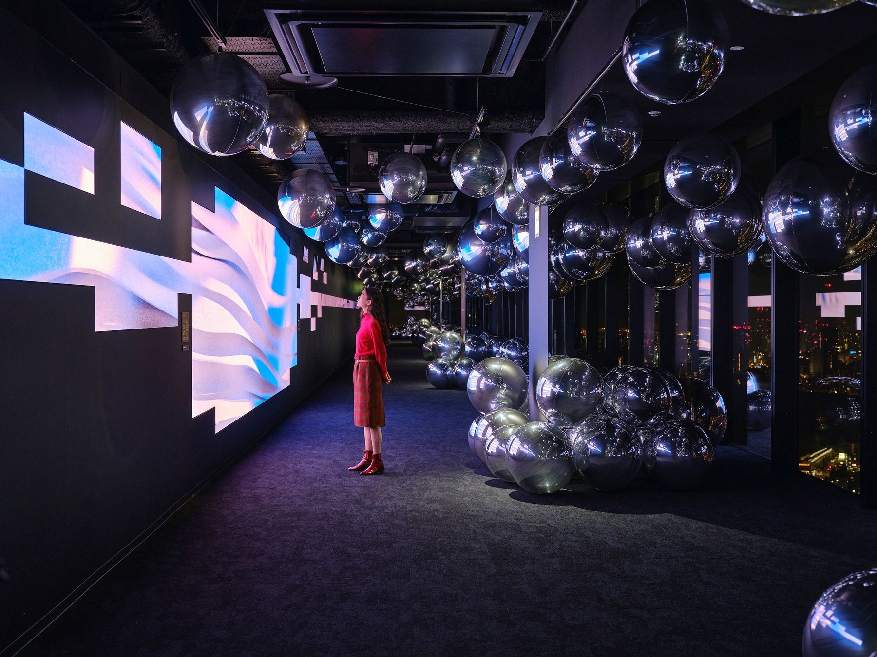 SKY GALLERYに現れた大量のミラーバルーンが刻々と変化する景色をぎゅっと映し込み、拡散します。日中には澄み渡った冬の青空が映り込み、夜にはイルミネーションきらめく都心の夜景が乱反射することで、いつ訪れても楽しめる展望回廊に。回廊を進むにつれてさまざまに変化する模様をぜひお楽しみください。