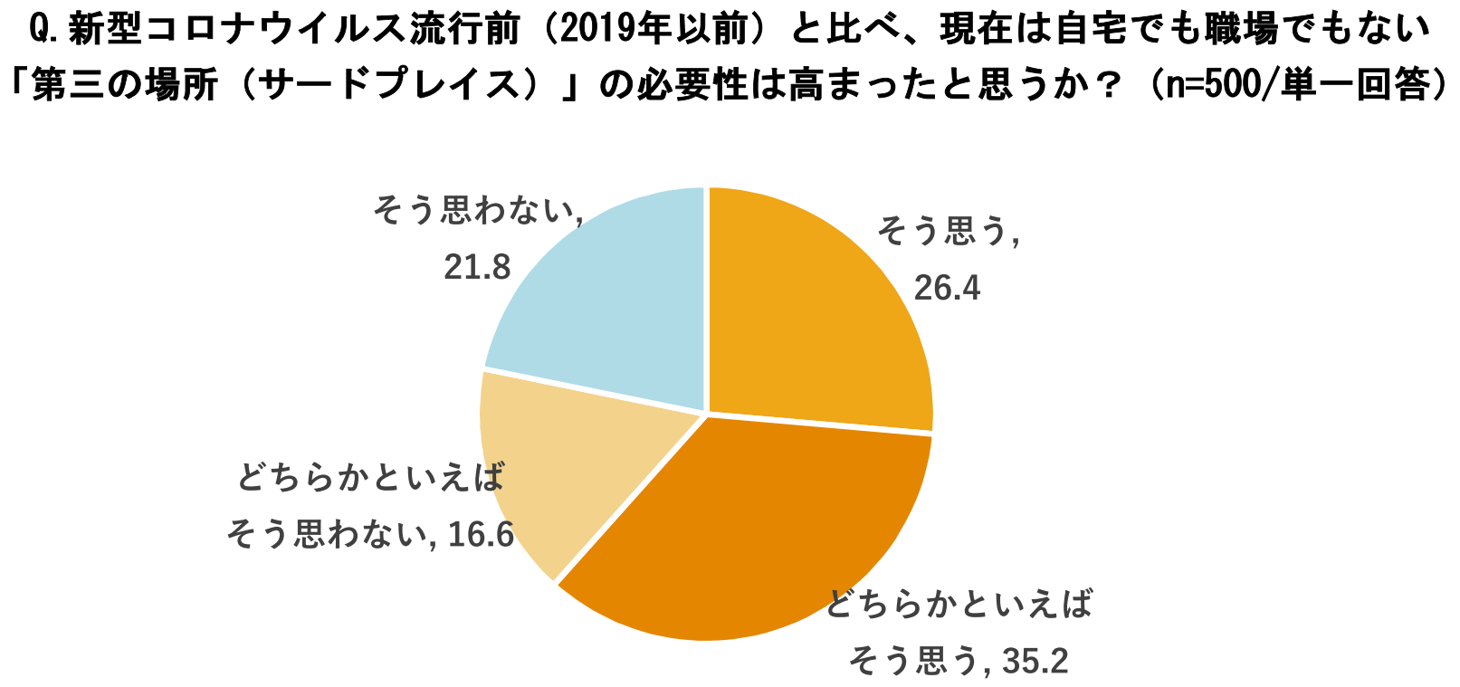 新型コロナウイルス流行前と比べると、61.6%が自宅でも職場でもない「第三の場所(サードプレイス)」の必要性が高まったと感じています。