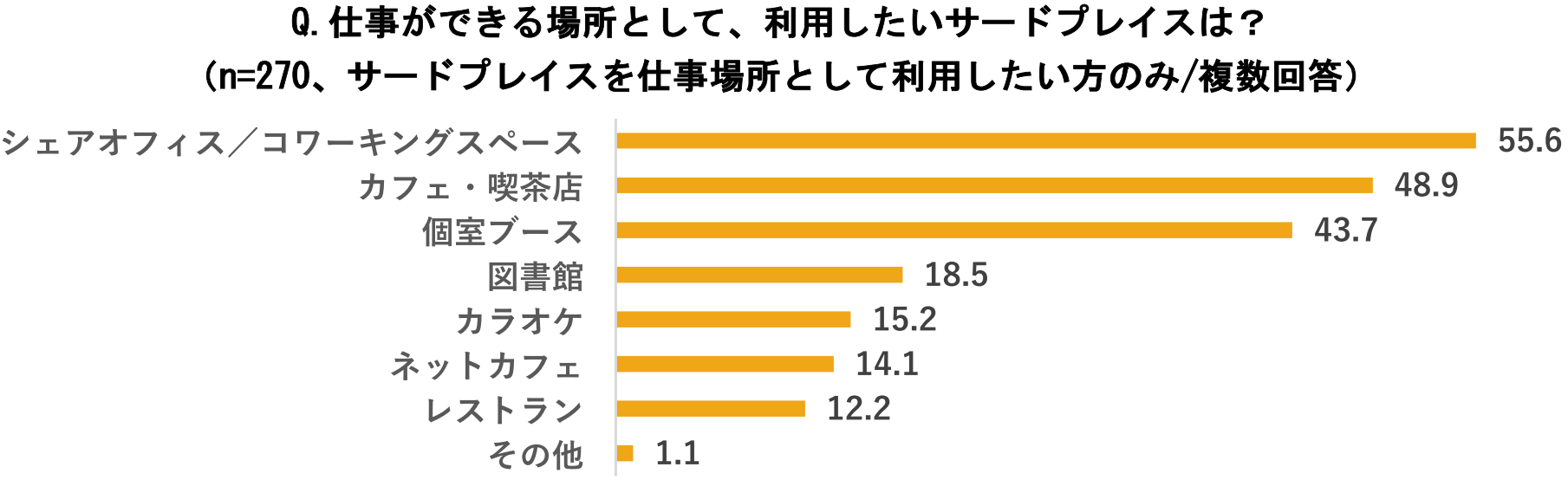 具体的に仕事場所として利用したいサードプレイスを聞くと、シェアオフィス/コワーキングスペースが55.6%でトップ、続いてカフェ・喫茶店が48.9%、個室ブースが43.7%となりました。上位3つは4位以下(図書館、カラオケなど)と30ポイント前後差をつけており、上位回答が仕事のできるサードプレイスとして主流のようです。