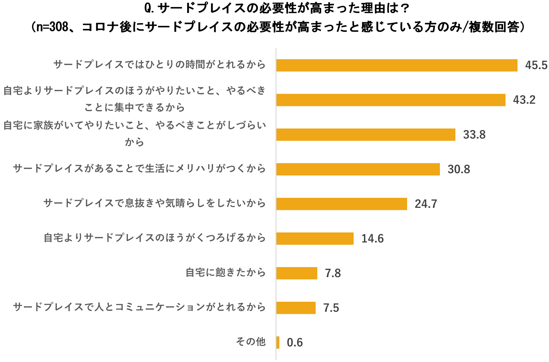 ■ 新型コロナ流行後、家でも職場でもないサードプレイスが求められるように。主な理由は「ひとりの時間がとれる」「やりたい、やるべきことに集中できる」「家だと家族がいる」