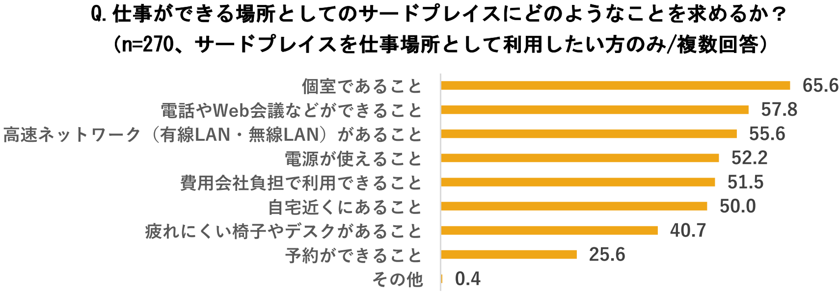 今回の調査結果から、半数以上の人がサードプレイスを効率的に働ける場所として捉え、さらに、「個室であること」「電話・Web会議ができること」が働く場所としてのサードプレイスに求められていることが明らかになりました。