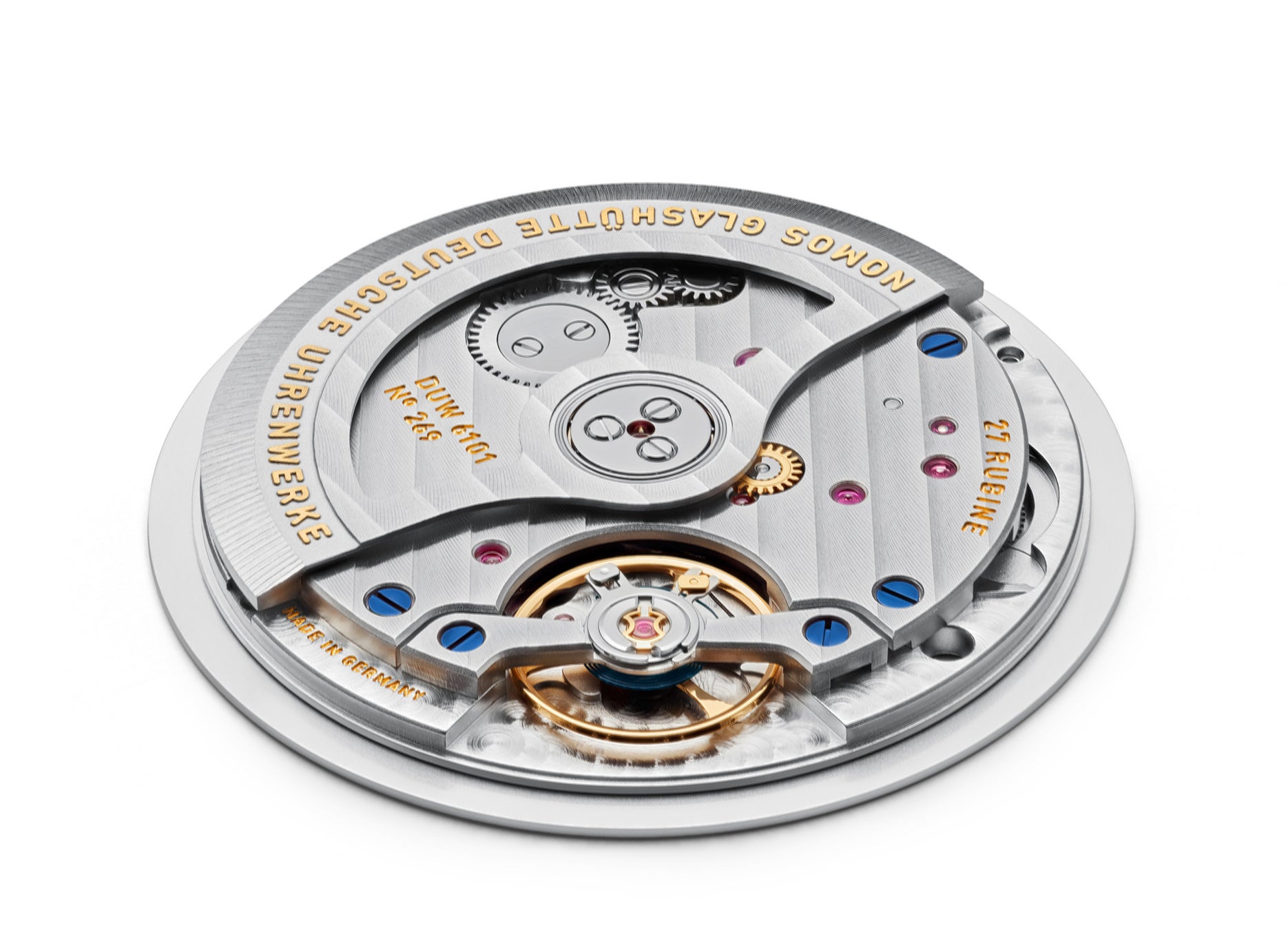 超薄型のデイト付き自社開発自動巻キャリバー、DUW6001。新たなアホイネオマティックデイト38のため、ムーブメント高さはそのままに直径を36mmから33mmへダウンサイズしました。この自動巻き日付キャリバーは、直径38.5mmのケースに収めるため、特別に改造したものです。