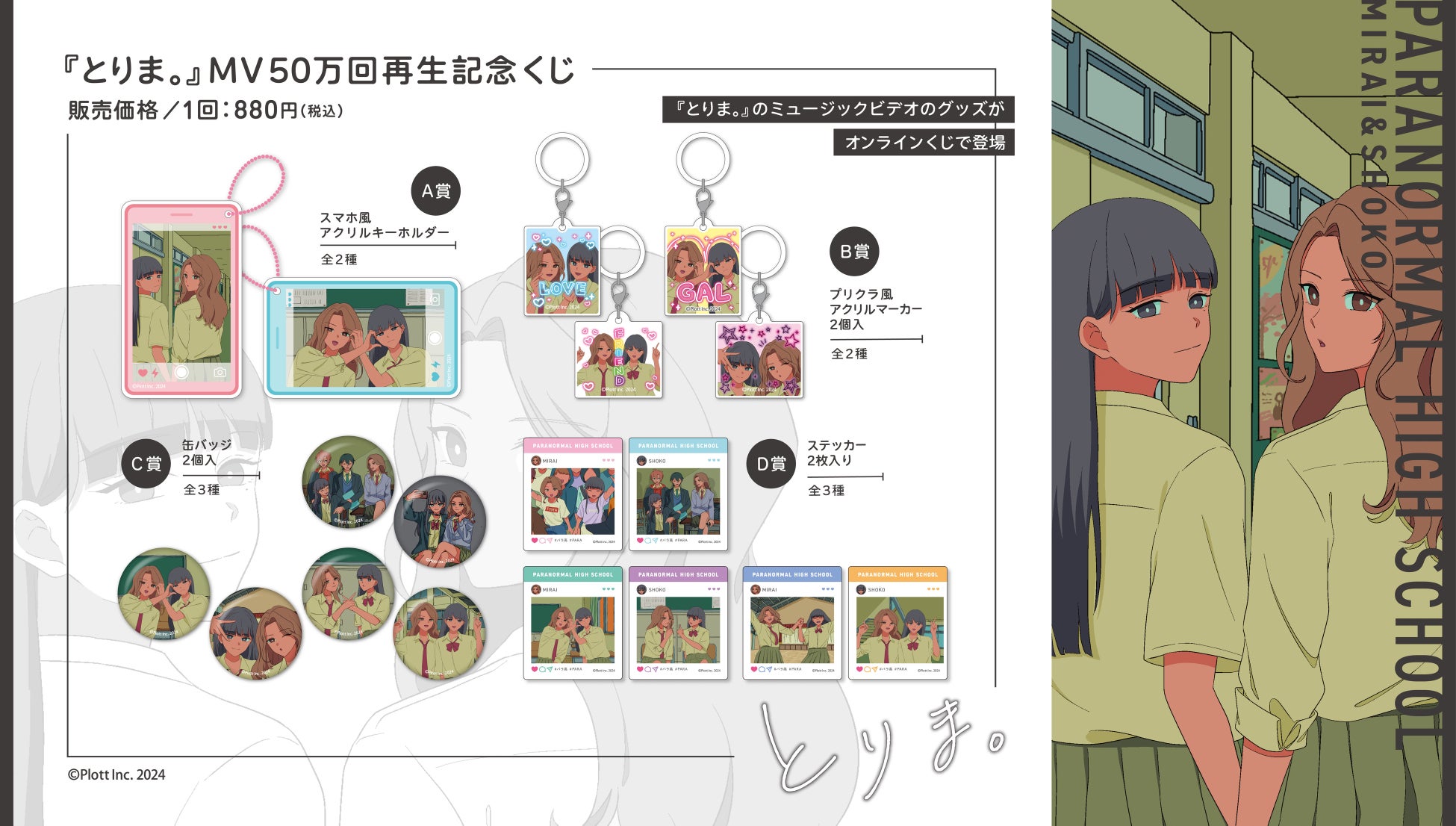 IPコンテンツの企画・制作・ビジネス展開を行う株式会社Plott(本社:東京都千代田区、代表取締役CEO:奥野翔太、以下「Plott」)は、『私立パラの丸高校』の見里未来 & 平翔子による初のオリジナル楽曲『とりま。』のミュージックビデオが50万回再生を達成したことを記念し、2024年12月13日よりSlash Giftにてオンラインくじを販売開始することをお知らせします。