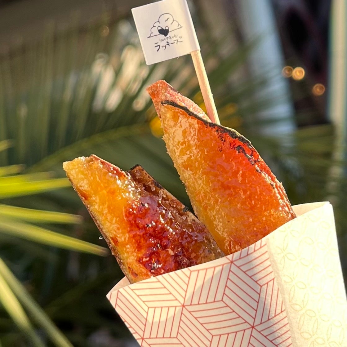 お味噌でブリュレした焼き芋になります。お芋とお味噌の組み合わせ、甘じょっぱいのがたまらないんです!日本の味噌と焼き芋、フランスのパリパリブリュレ。ワクワクスイーツをパクっと皮ごとお召し上がりくださ~い。