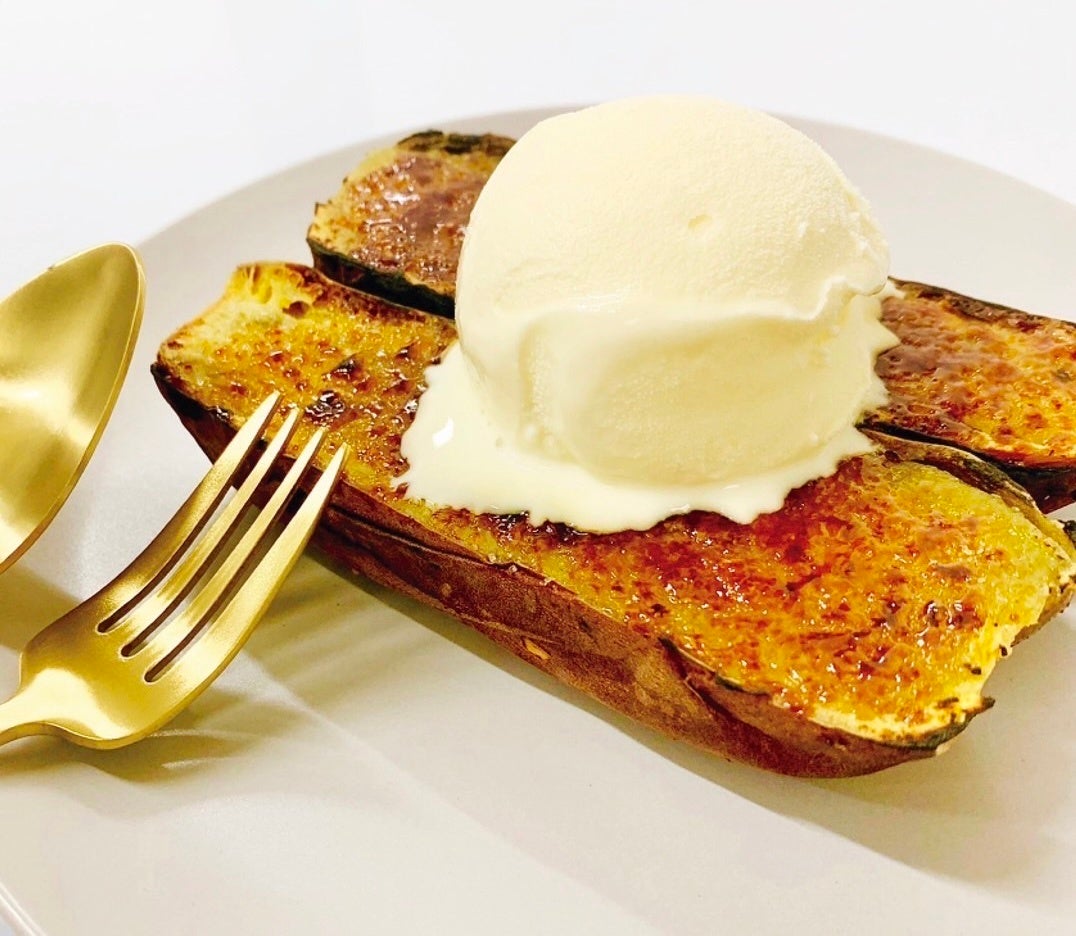 糖度50度以上の焼き芋にフランス産の高級砂糖を使ってブリュレし、濃厚バニラアイスを添えました。トロトロ焼き芋にパリッとブリュレ、グラニュー糖では出せないコクとちょっぴり苦味をきかせた大人な味わいがたまらない当店の人気ナンバーワンスイーツ。
