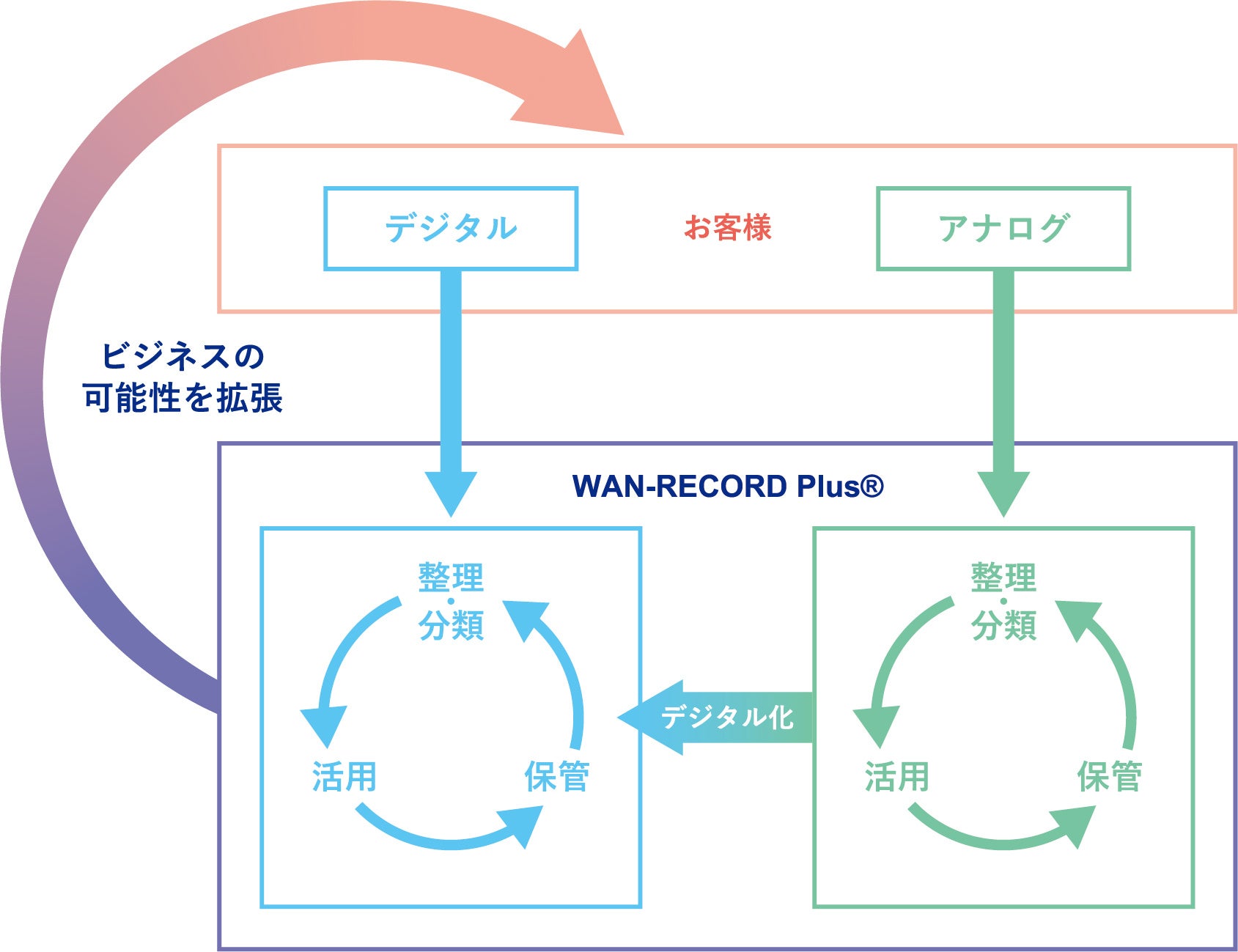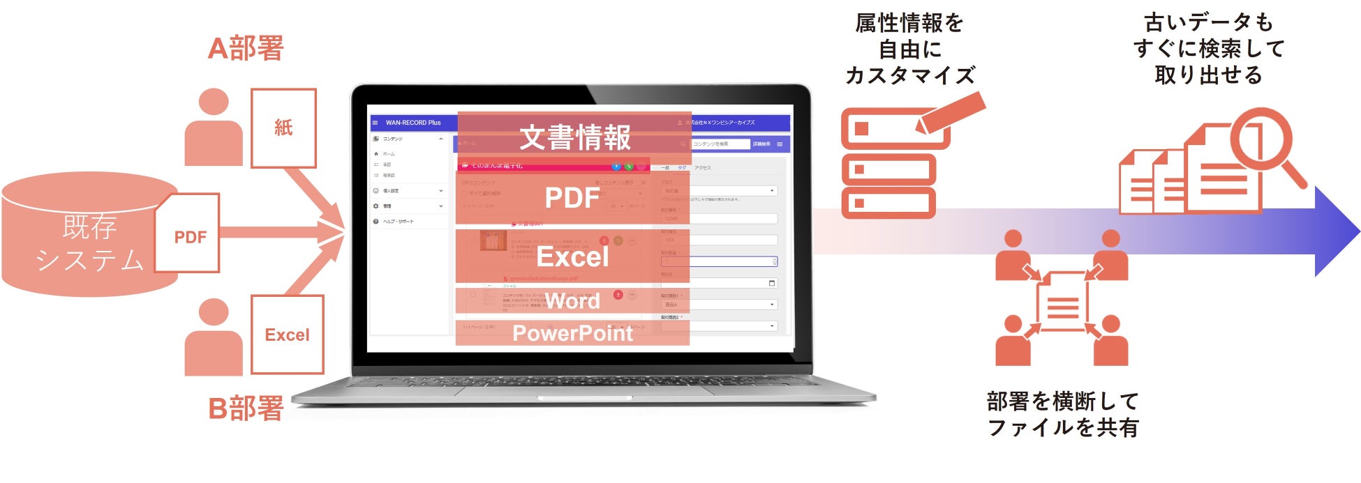「WAN-RECORD Plus」は、引き継ぐべき情報資産を、未来にわたり活用できる基盤として作り出すことをコンセプトに開発された、新しいクラウドアプリケーションサービスです。業務の様々な記録をレコードとして保管し、属性情報を付加することで、レコード作成者と利用者双方の業務効率化を実現します。