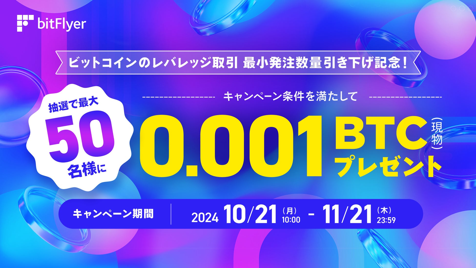 キャンペーン期間中に bitFlyer Crypto CFD で 0.001 BTC-CFD 以上取引されたお客様の中から、抽選で最大 50 名様に 0.001 BTC(現物)をプレゼントいたします。