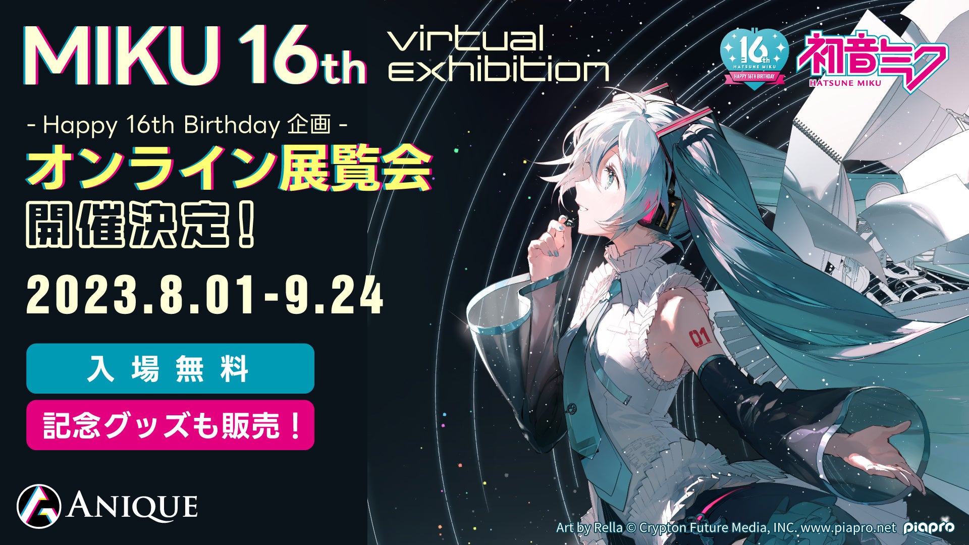 Anique株式会社(本社:東京都渋谷区、代表取締役:中村太一)は、『初音ミク』誕生16周年を記念したオンライン展覧会を8月1日(火)より開始いたします。