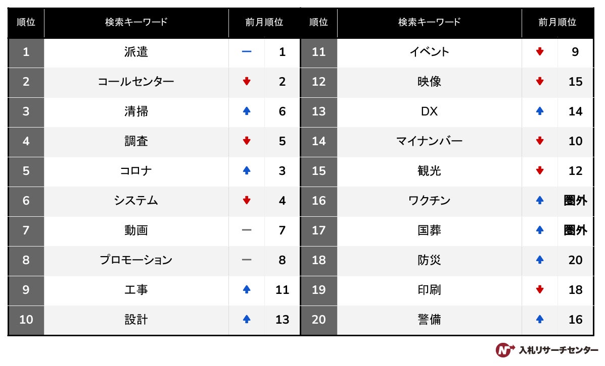 検索回数NO.1は「派遣」となりました。安倍元首相の国葬に関する案件は前月のトピックスとしても取り上げましたが、注目度が非常に高く、入札案件の検索キーワードでも17位にランクインしました。新型コロナワクチン4回目接種の動き出しもあり、16位の「ワクチン」も圏外から浮上してきています。